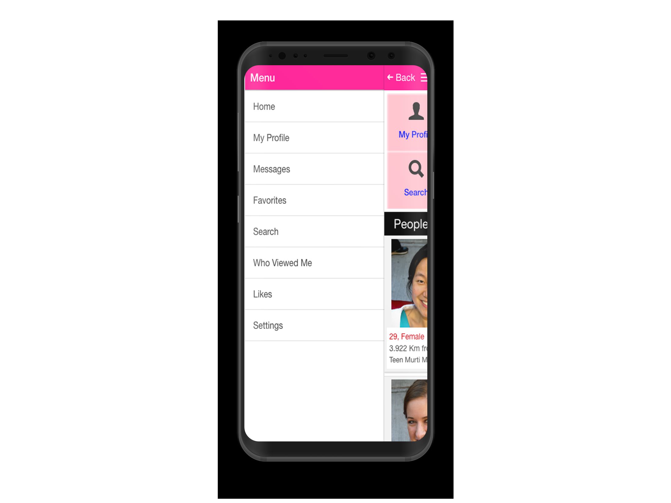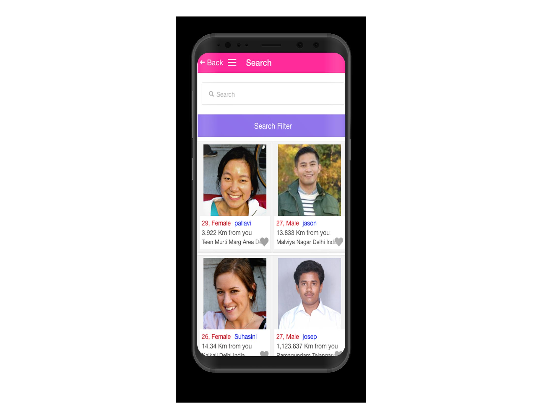 - We can see nearest profiles with how many kilometers they are, based on our location using latitute and longitude values
