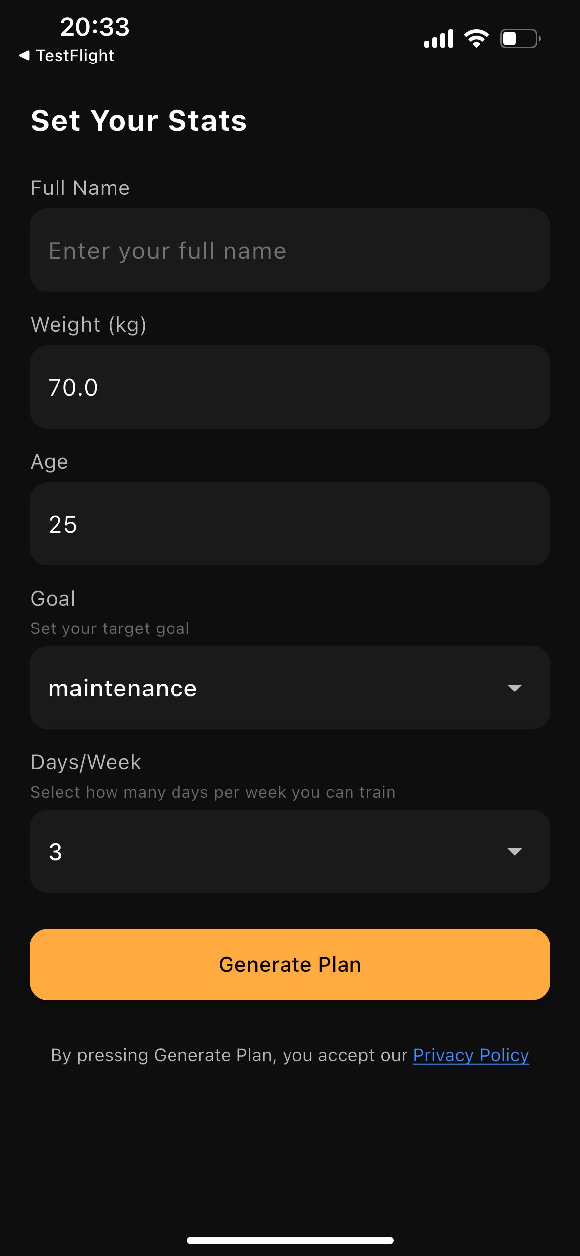 Profile Section: Enter your information, and a basic summary of your nutrition (calories, protein, fat, and carbohydrates) and workout days will be generated.