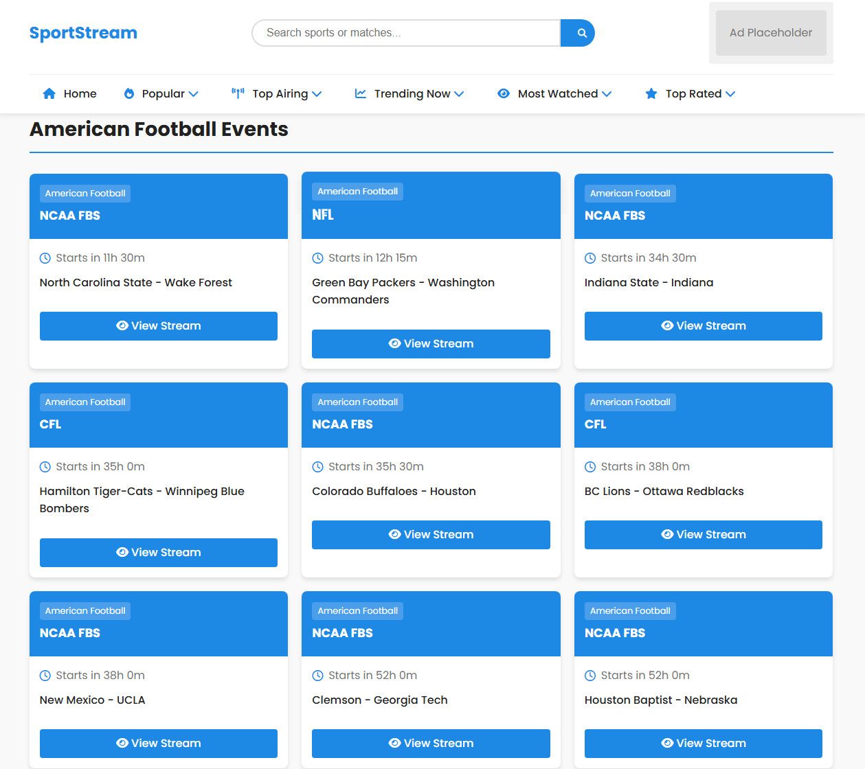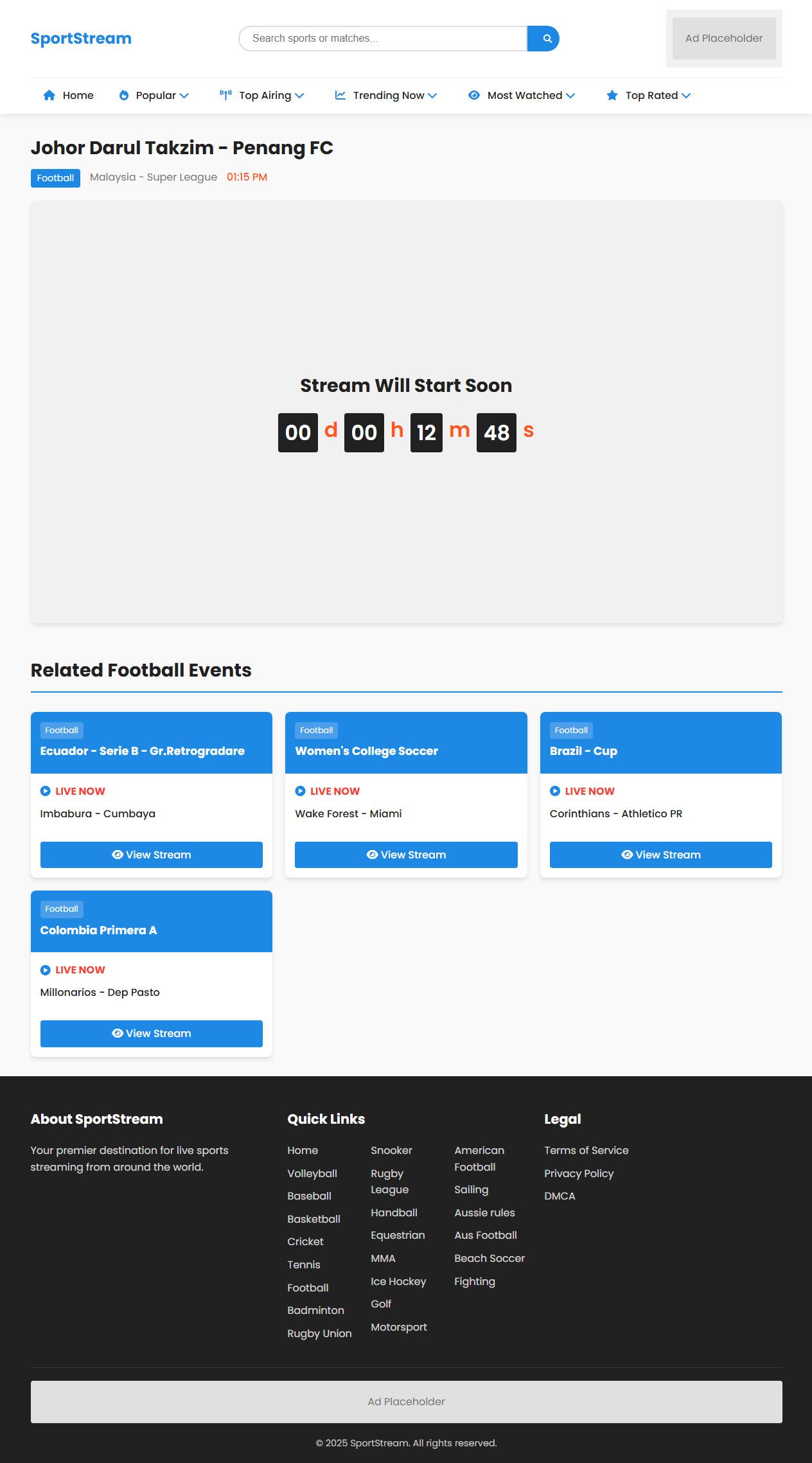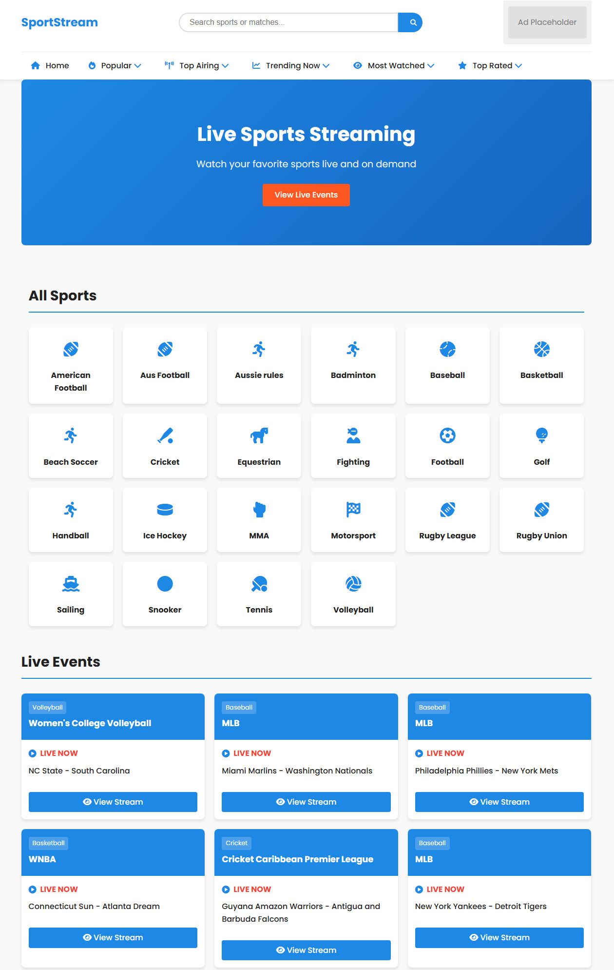 SportsStream is a powerful PHP sports streaming script designed for creating your own live sports website in minutes. The script is fully automated with API integration, allowing you to fetch and display live matches, events, and categories without any manual updates.