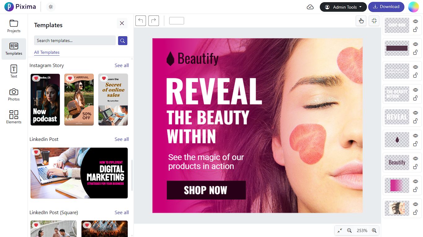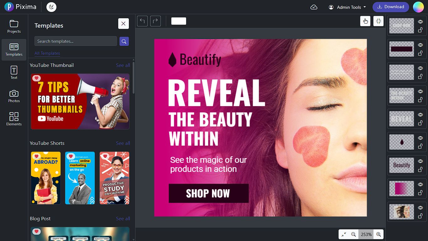 With Pixima, anyone can easily design banners, marketing visuals, YouTube thumbnails, social media graphics, book covers, ads, and more—all through a simple, intuitive interface.