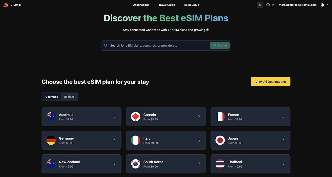 The platform connects users with eSIM providers for instant mobile data while traveling internationally.E-Simci - eSIM Marketplace Platform