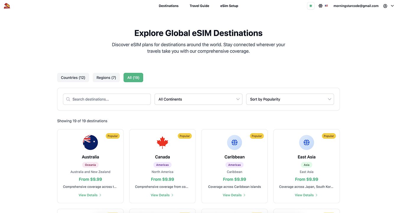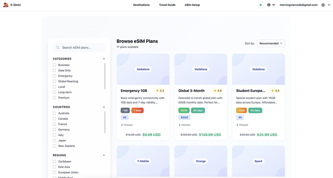 - eSIM Discovery: Advanced search and filtering system for eSIM plans by destination, data amount, validity, and price.