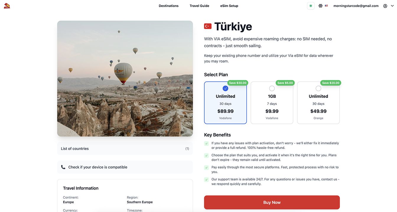 - eSIM Plan Details: Rich product pages with coverage maps, network information, pricing, and user reviews.