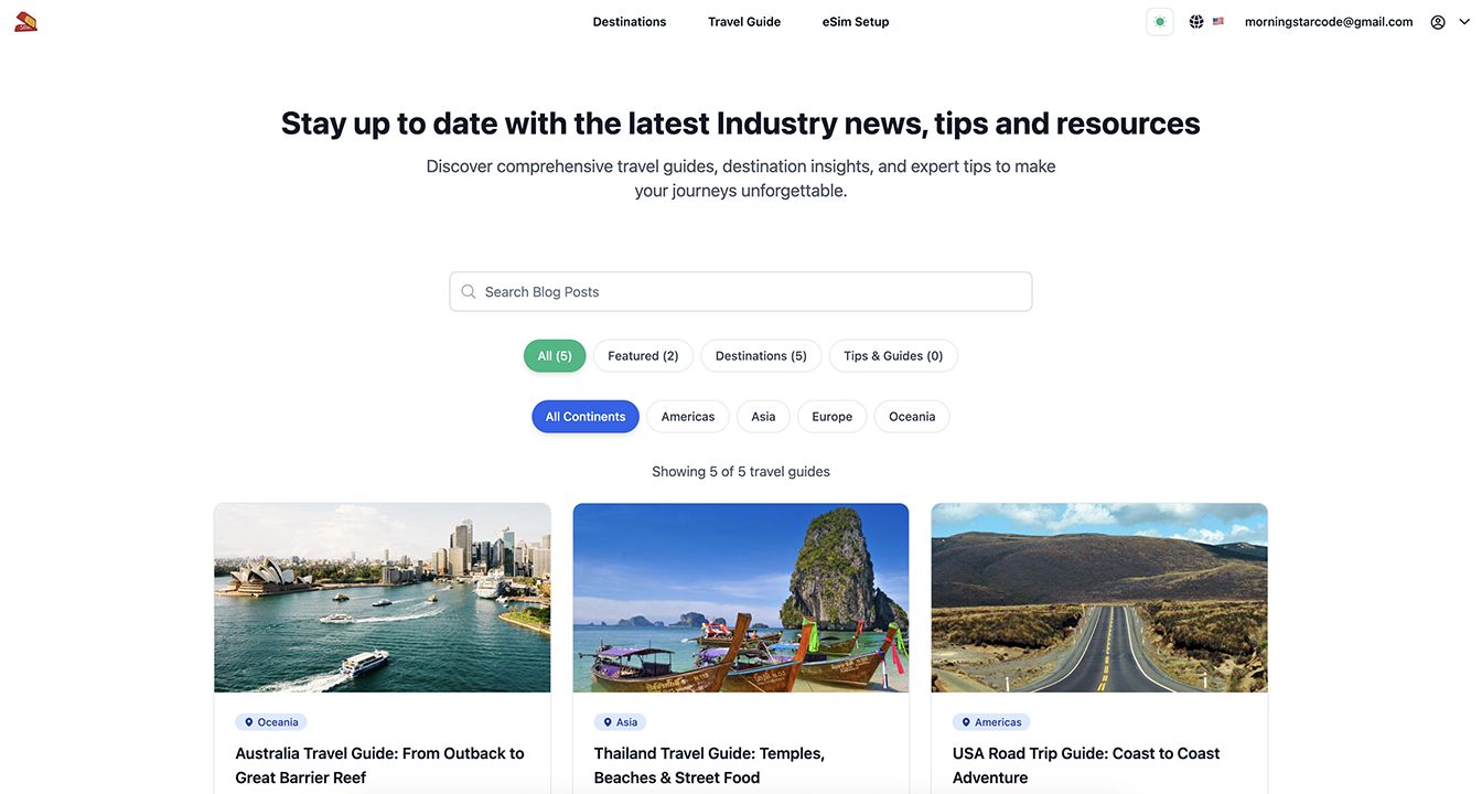 - Travel Guides: Destination-specific travel content with eSIM recommendations and connectivity tips.
