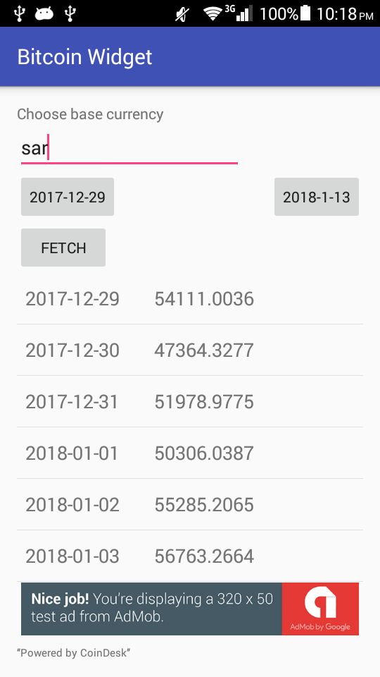 Android application studio to display bitcoin rates using different currencies base. It is compile with API 14 and later which means it supports approximately 100% of devices in google play market. It has great features such as showing historical bitcoin rates and admob integration. It has app widget to show bitcoin rates on Home screen with automatic refresh.