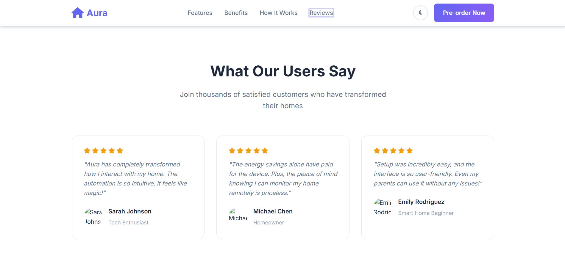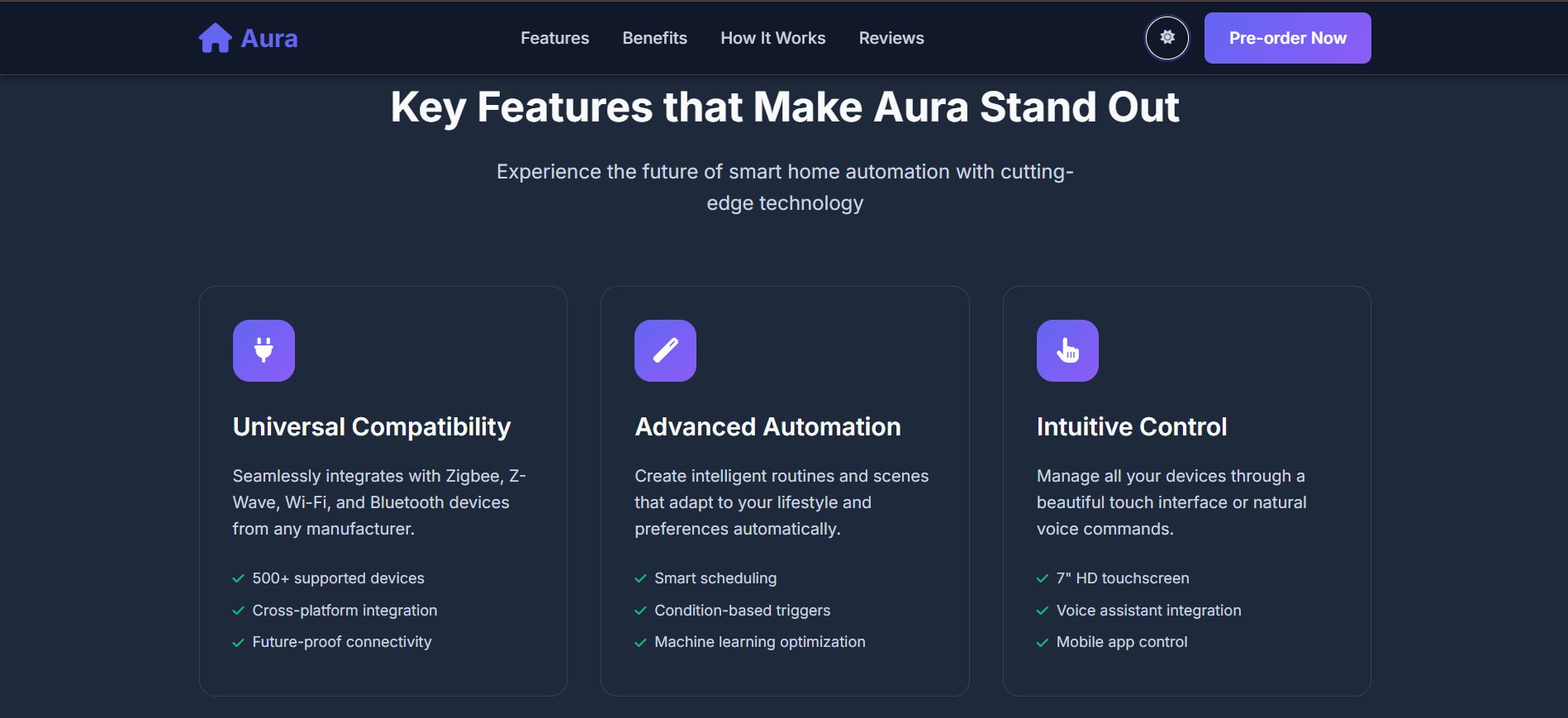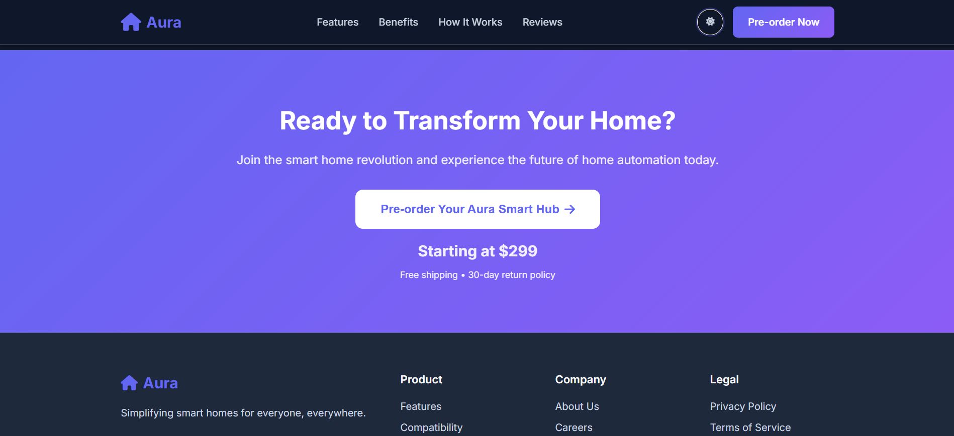 Responsive smart home landing page with Dark & Light mode, clean code, and modern design.Aura - Smart Home Landing Page Template