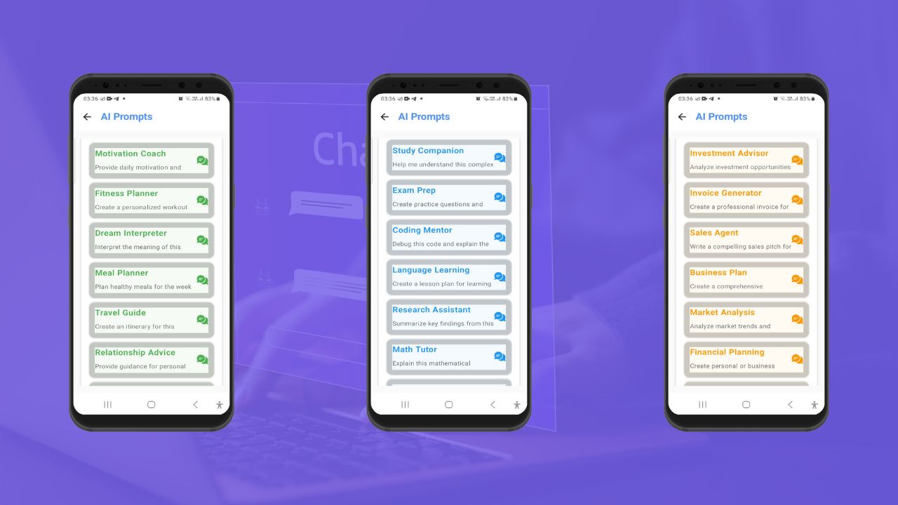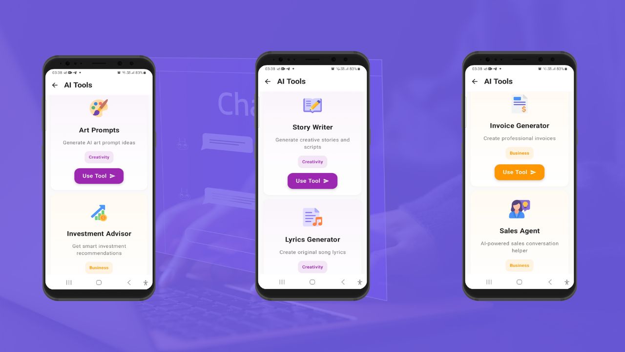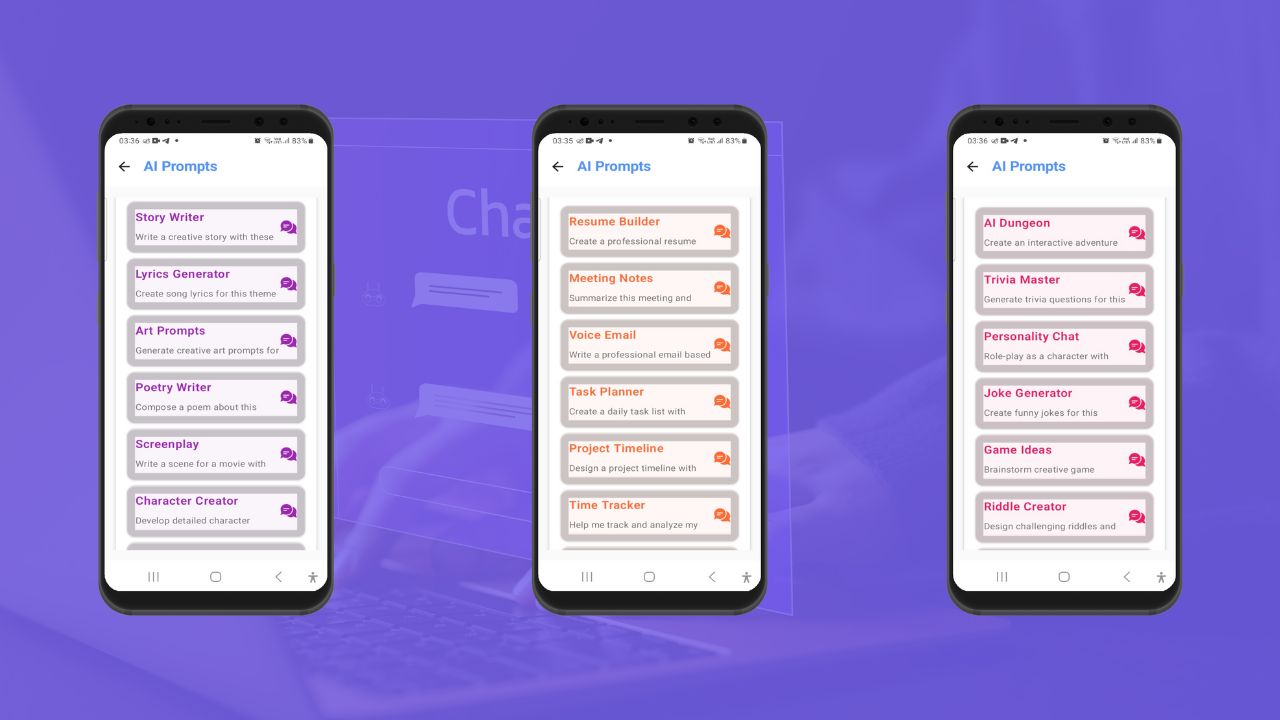 Each category is powered by the same AI chatbot engine, but provides different roles & styles of conversation – making it feel like multiple AI tools in one app.