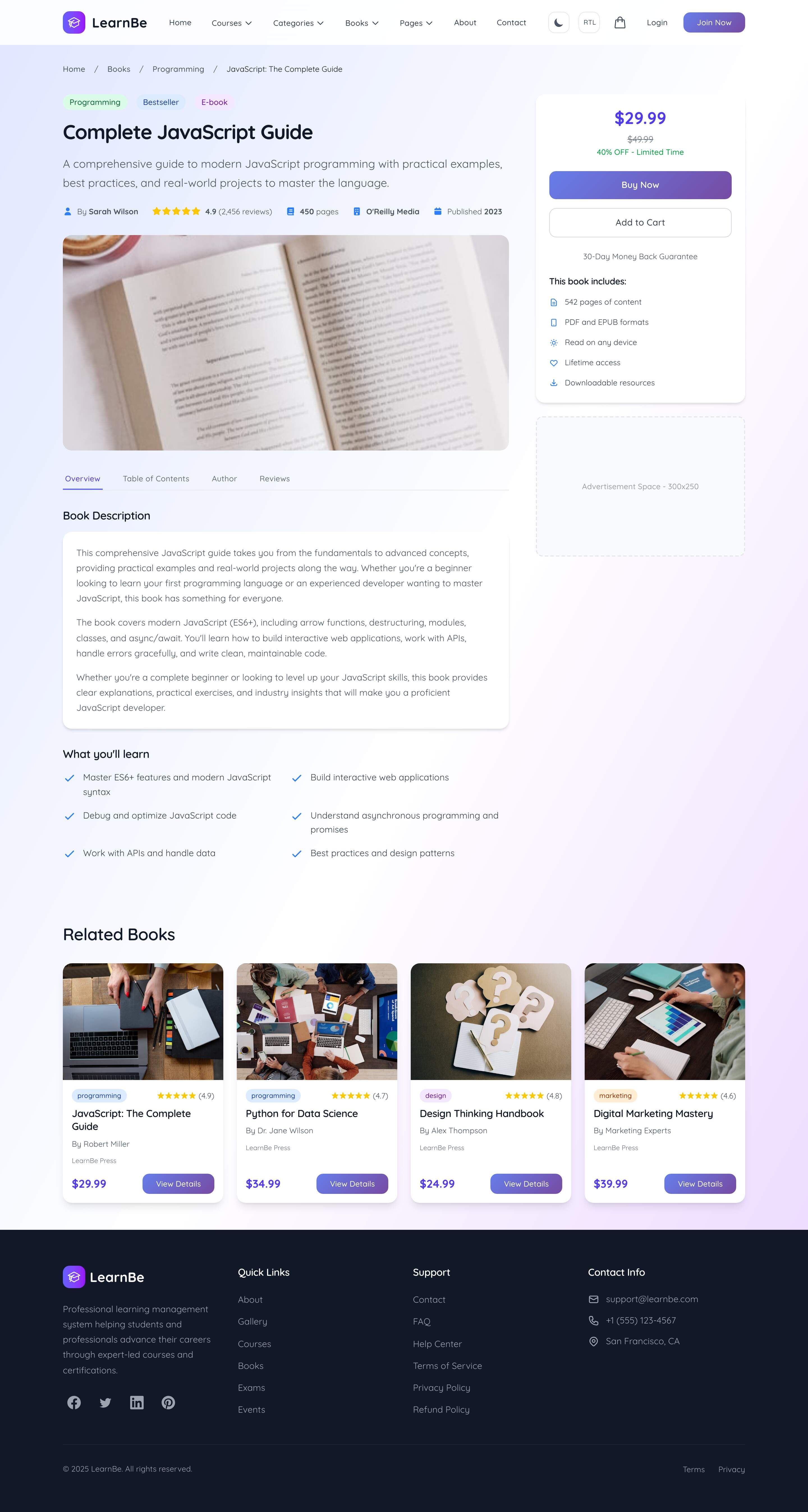 LearnBe is a comprehensive, modern Learning Management System (LMS) template designed for educational institutions, online course platforms, and e-learning businesses. Built with HTML, CSS, and JavaScript, this template provides everything you need to create a professional online learning platform.