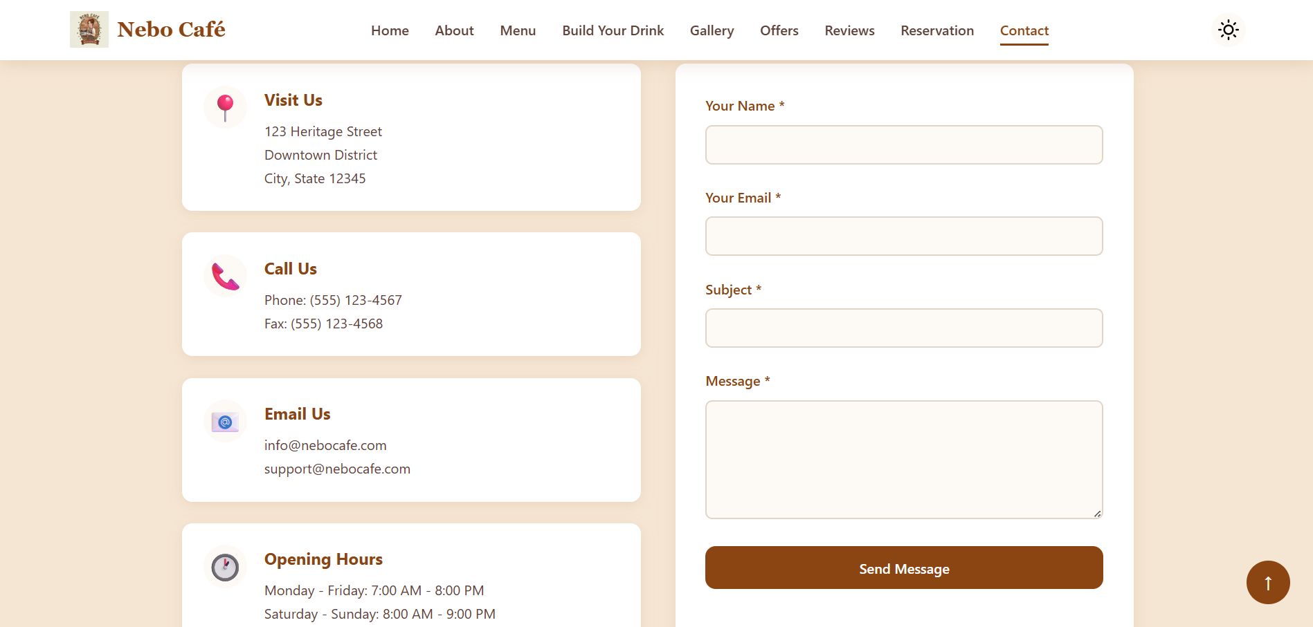Nebo Café – Modern Coffee Shop Website Template is a stylish and fully responsive HTML template designed for cafés, coffee houses, and small restaurants.