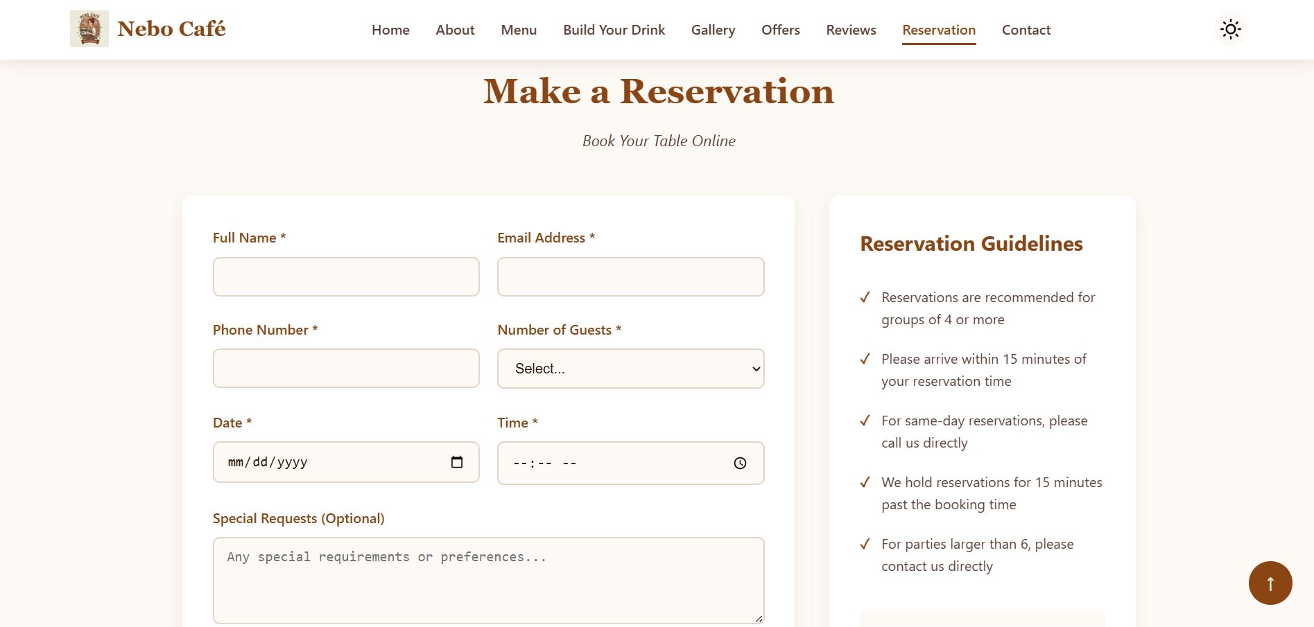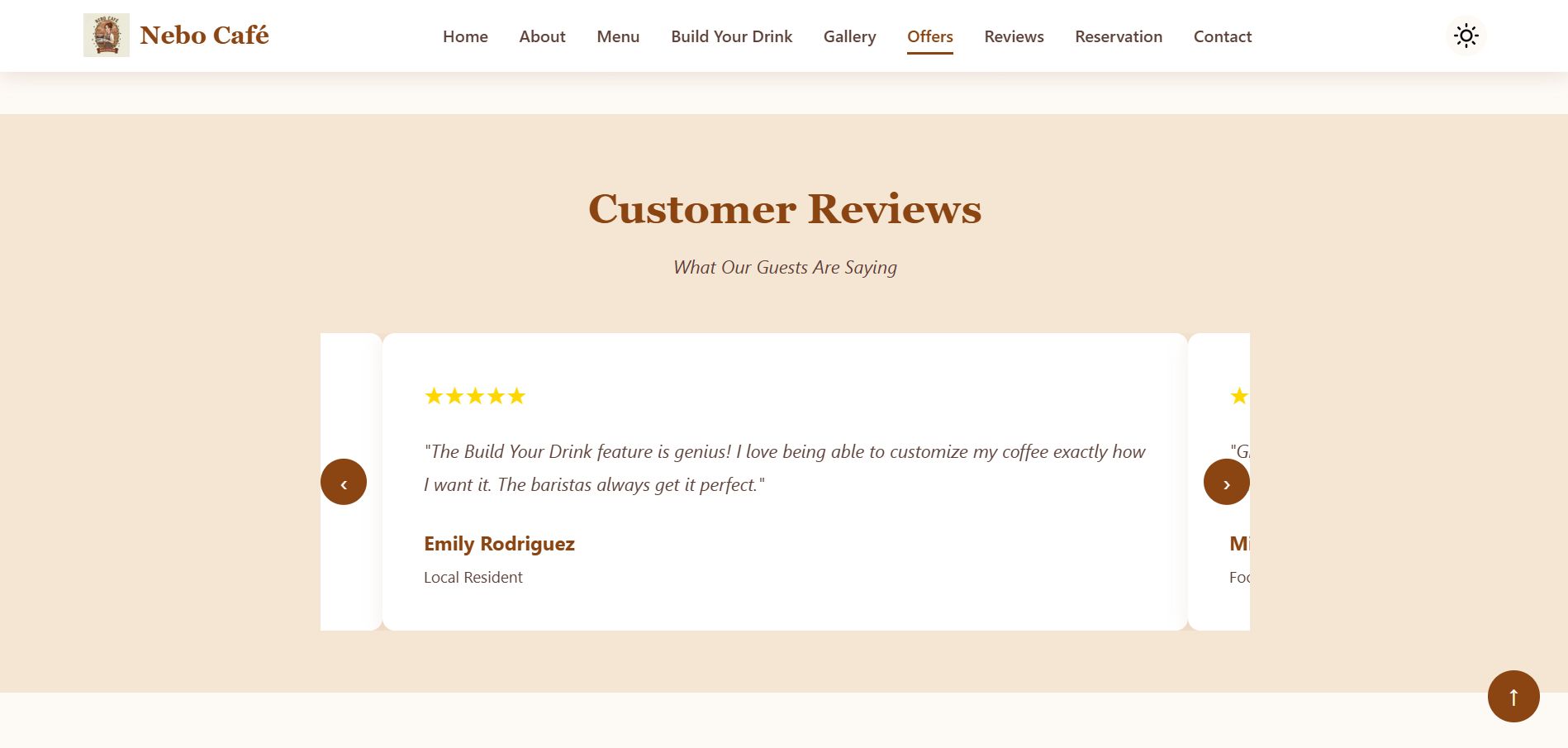 The website includes all essential café sections such as menu display, “Build Your Drink” customization, special offers, customer reviews, and a reservation form — all crafted with attention to detail and smooth animations.