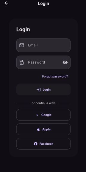 Wire up your auth provider (Firebase/Supabase/custom API) inside the placeholder service