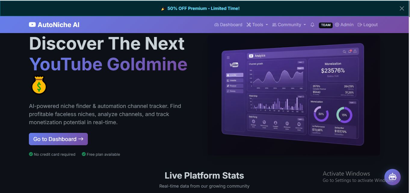 AI-powered platform for discovering profitable YouTube niches, tracking competitors, and estimating monetization potential.AutoNiche AI – YouTube Automation Niche Research