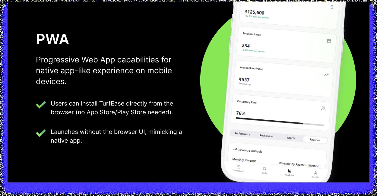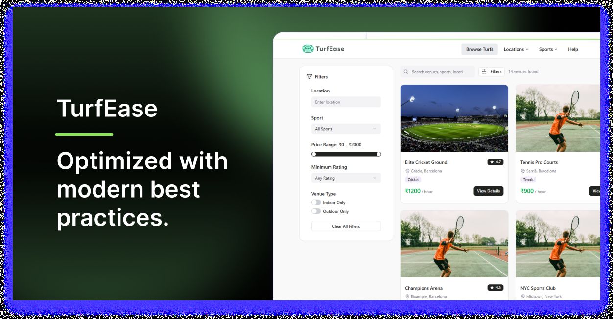 - Advanced venue search with filters for location, price, amenities, and availability to help users find the right turf quickly.