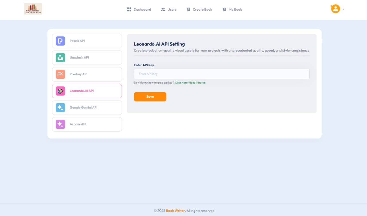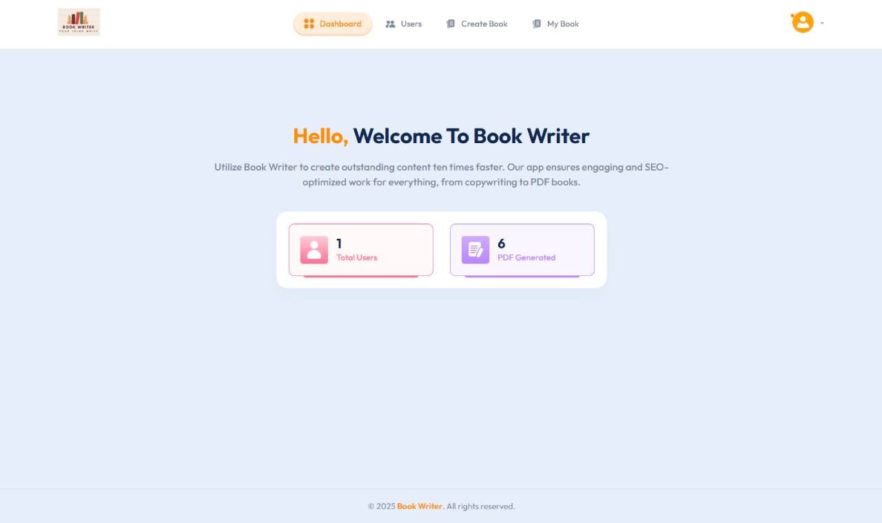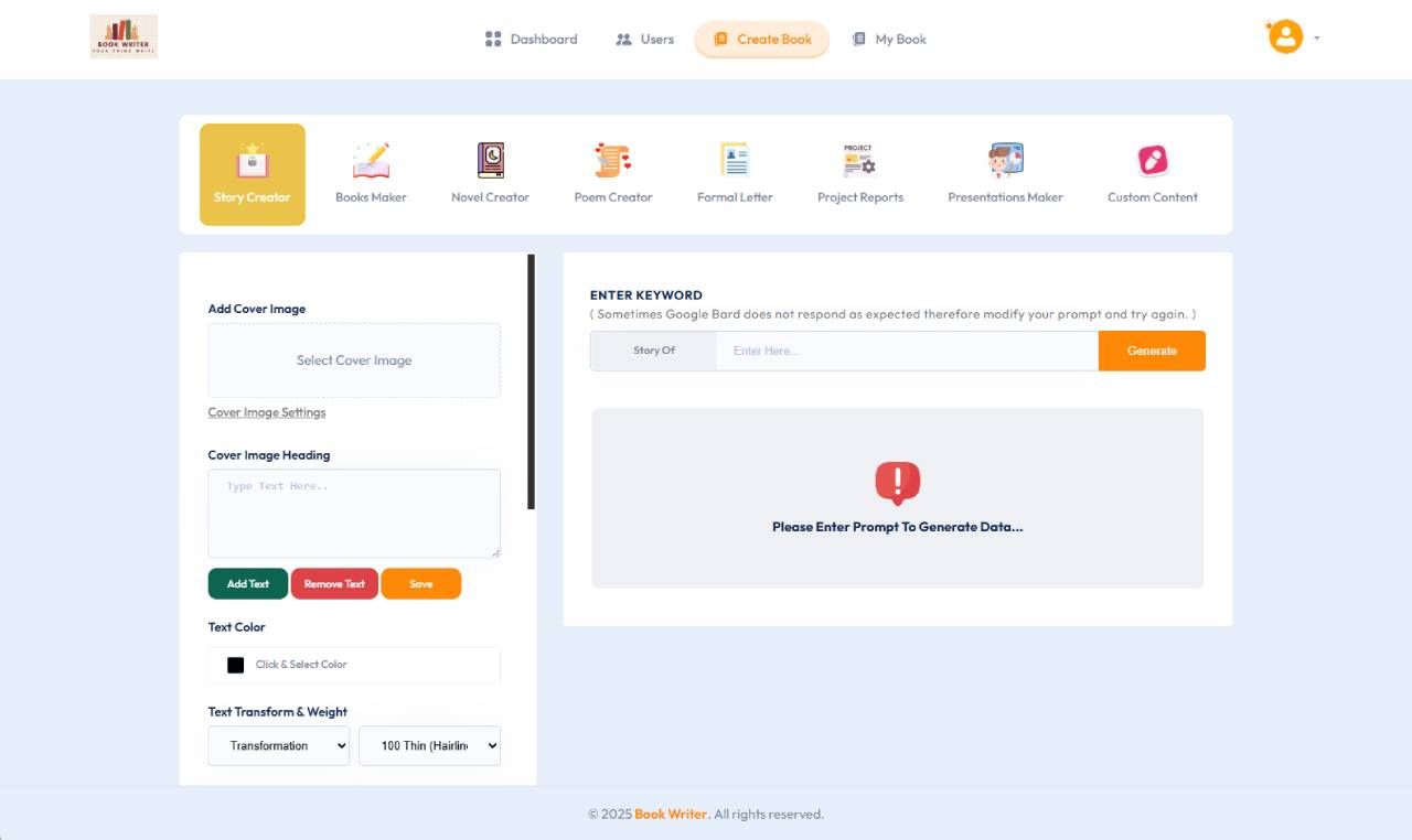 Book Writer goes beyond traditional book creation. Whether you're working on a novel, poem, project report, presentation, formal letter, or custom content, our script offers a versatile solution for all your creative needs. The intuitive admin dashboard empowers you to manage users, customize profiles, and effortlessly add API keys. Track your progress by easily viewing the books you've created within the platform. Customize your content with options to manage font style, font color, font weight, add cover images, and include text below them. Choose from a variety of pre-built design styles to give your PDFs a polished and professional look.