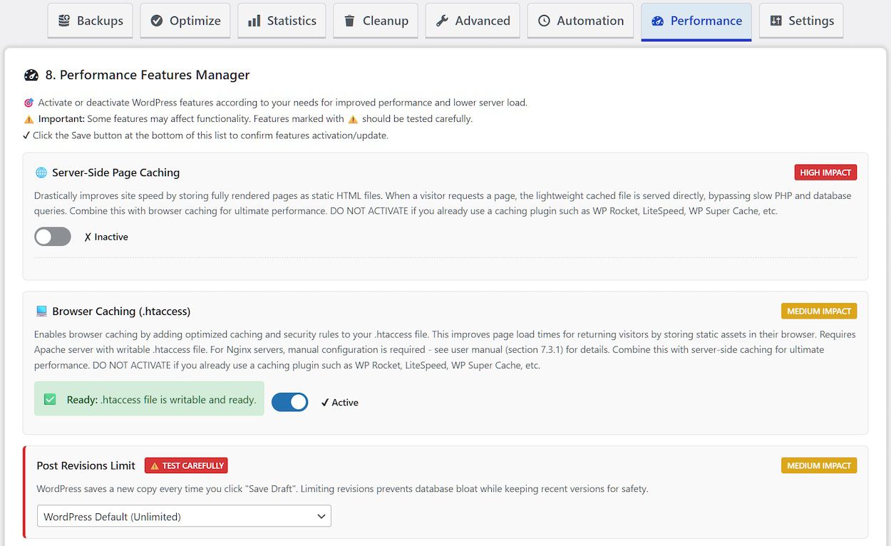 Performance Fine-Tuning Suite. Control WordPress core features to eliminate unnecessary overhead. Disable XML-RPC for security, limit post revisions to prevent bloat, adjust the Heartbeat API frequency to reduce server load, and remove unused components like emoji scripts and shortlinks. Each optimization includes clear descriptions of its impact.