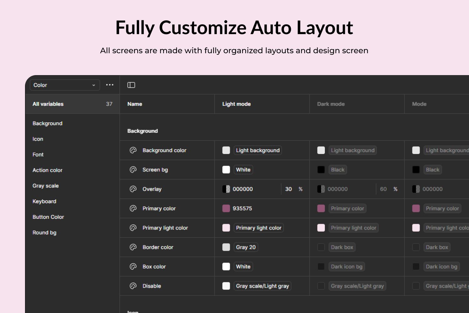 It includes 50+ polished, pixel-perfect screens, built on a variable-based design system, with seamless Light & Dark Mode support and auto-layout components — all ready for customization.
