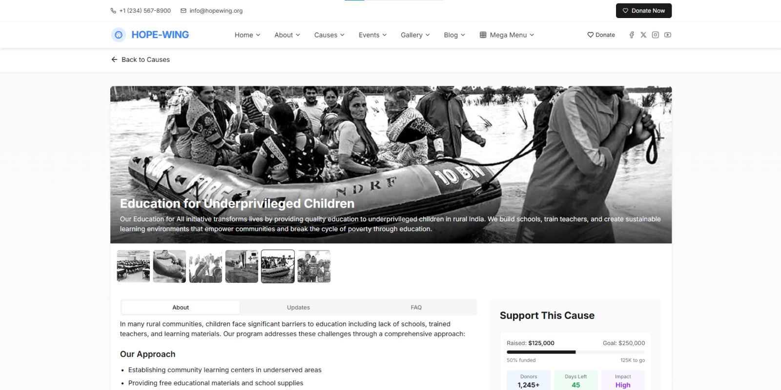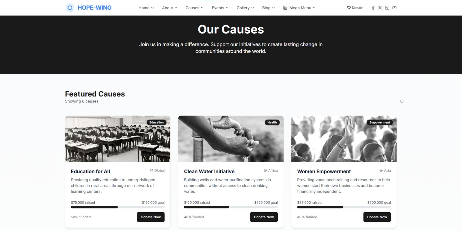 HopeWing frontend solution for NGO and organizations showcasing their cause and impact on society...