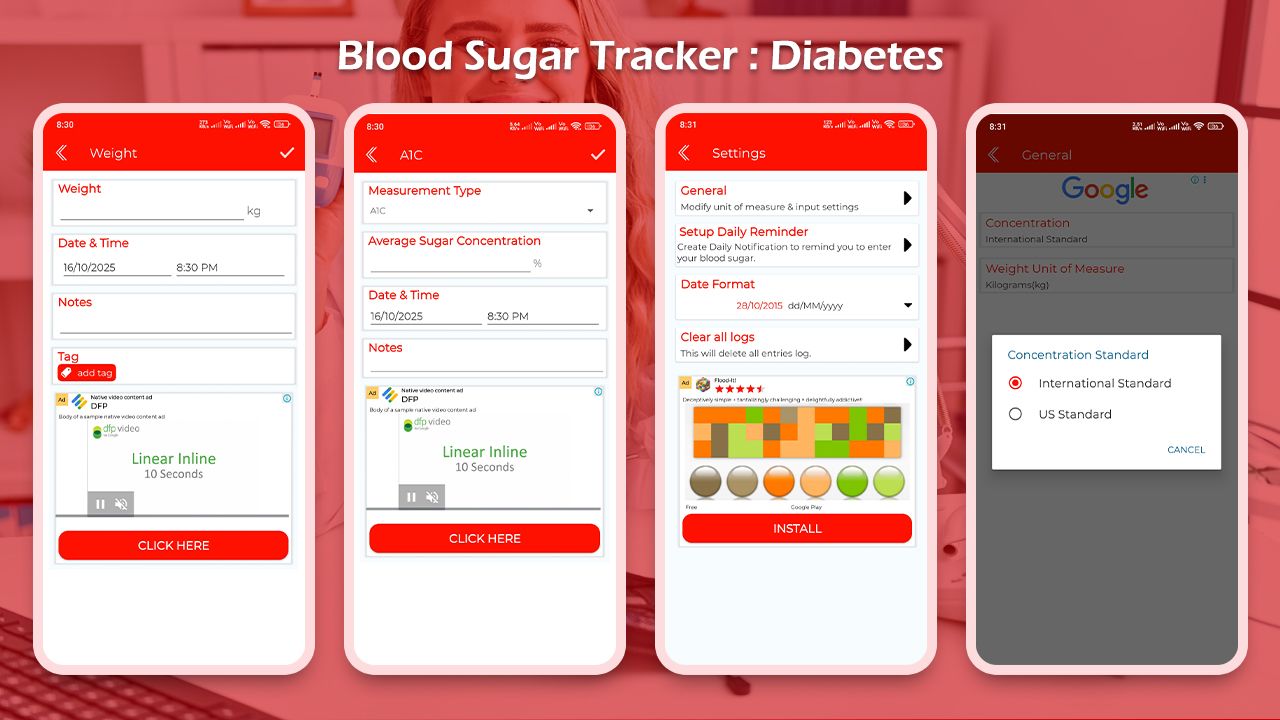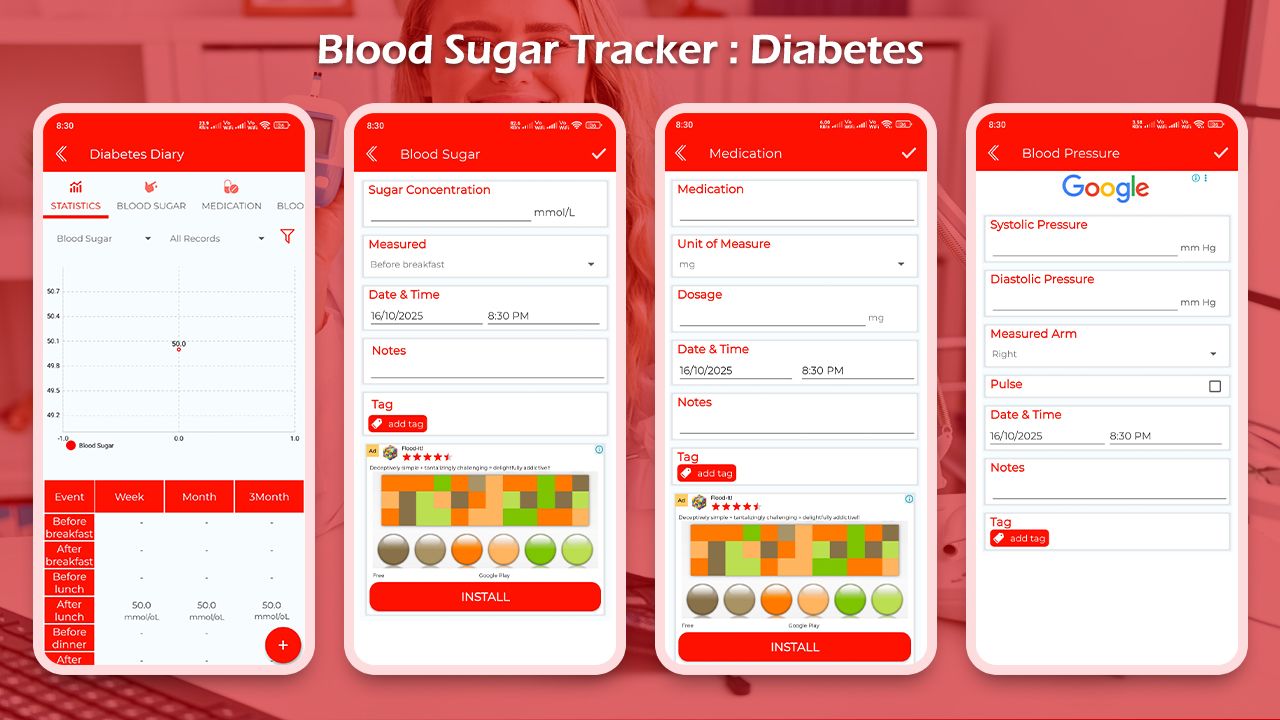 Blood Sugar Tracker provides Blood Pressure, Medication, Weight, A1c, Statistics, Daily Reminder.Blood Sugar Tracker - Diabetes Diary Android App