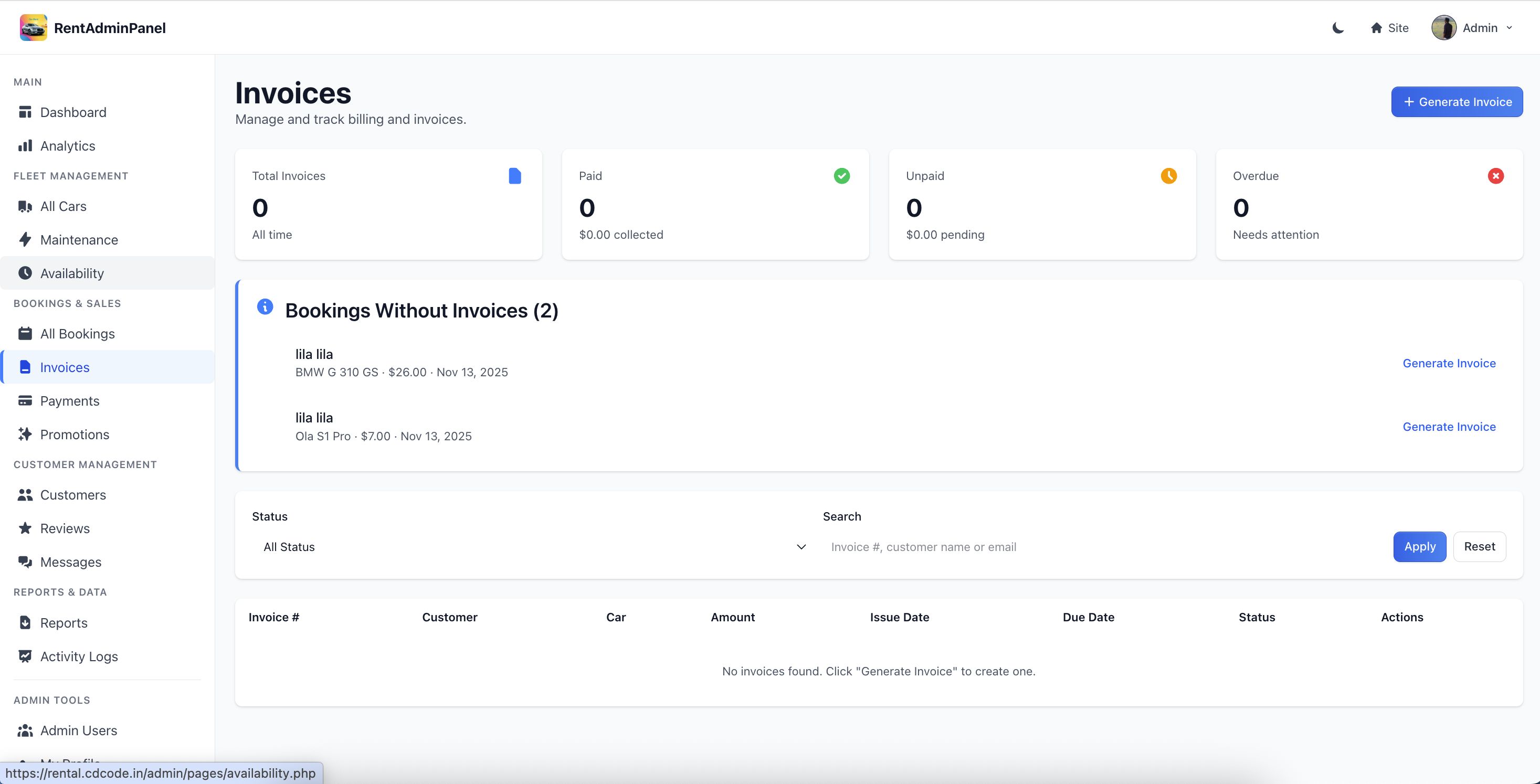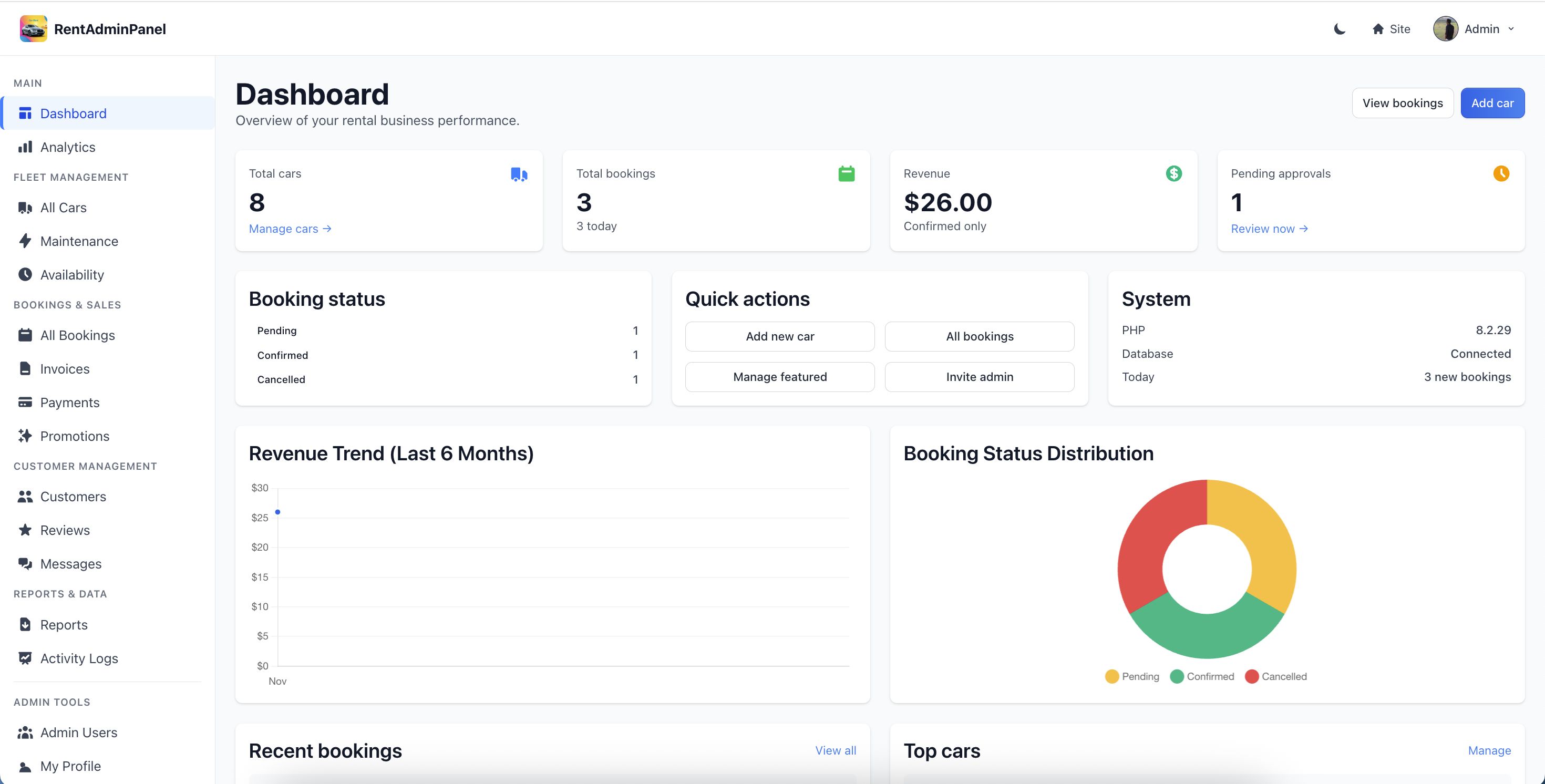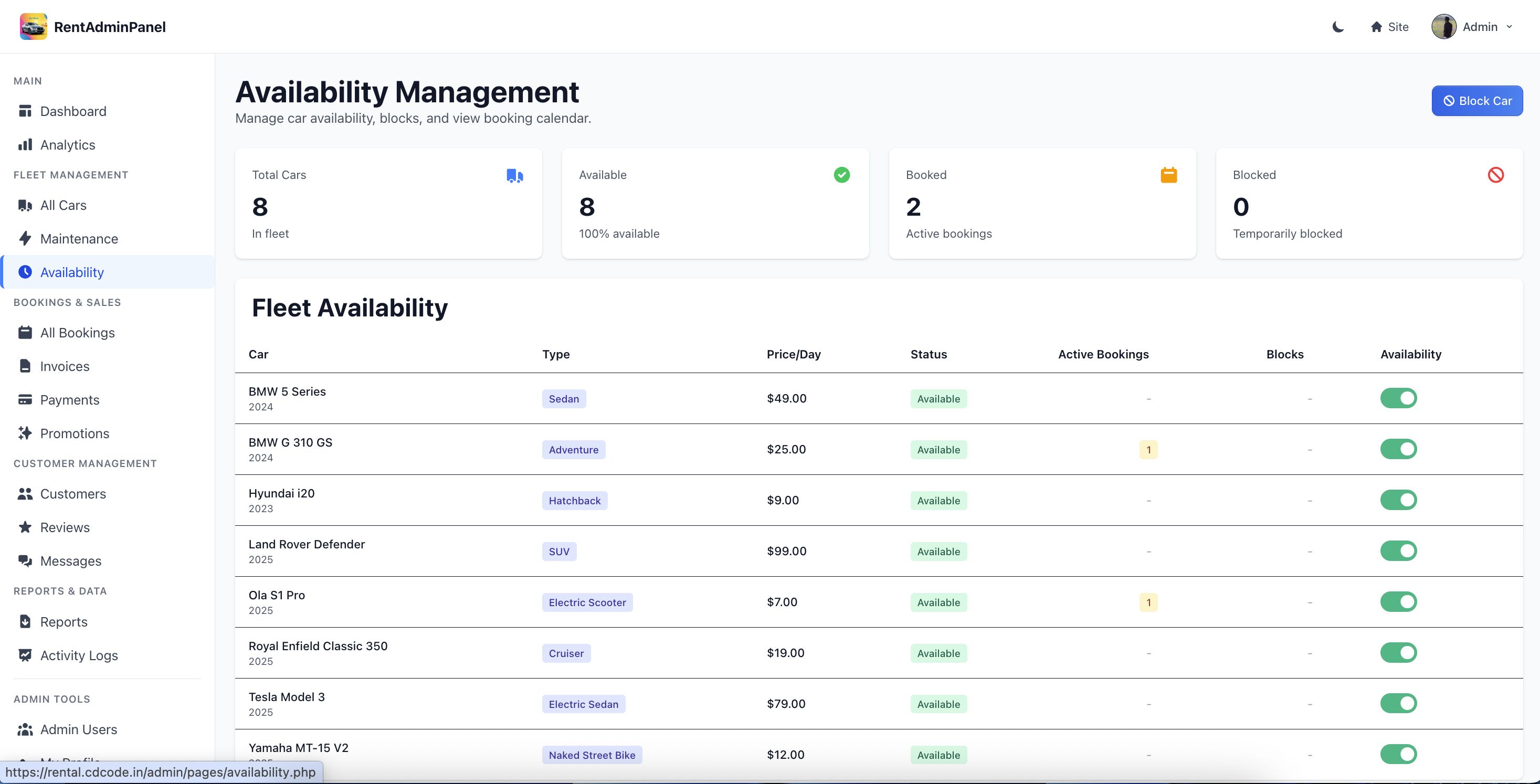 Overview A production‑ready Car & Bike Rental PHP script. Customers can search, book, apply promo codes, pay via Razorpay or PayPal (or wallet), review vehicles, mark favorites, and manage bookings. The admin panel manages fleet, pricing, availability blocks, promotions, affiliates, users, settings, email templates, and reports. One‑click installer and modular helpers—no heavy framework.