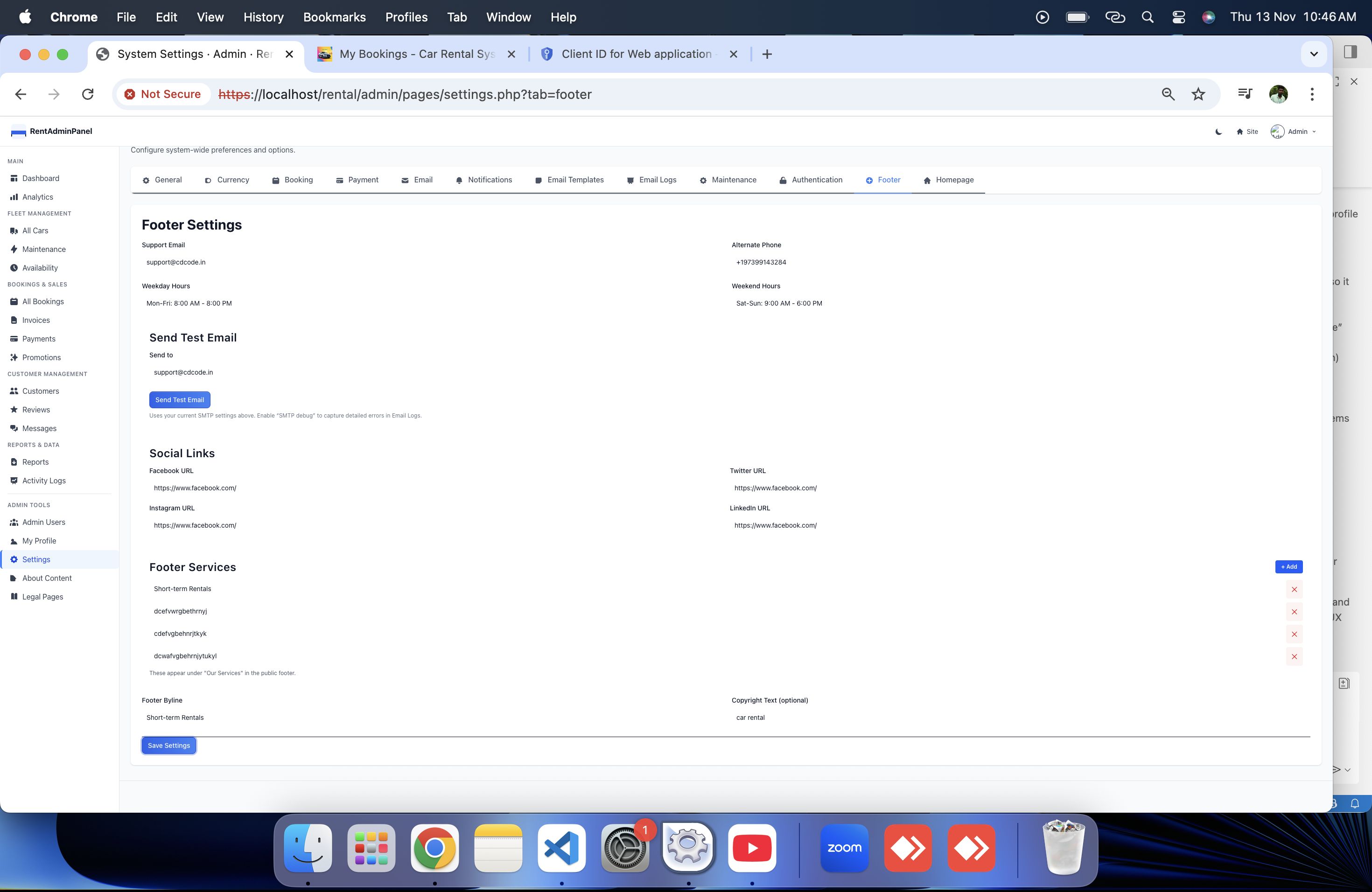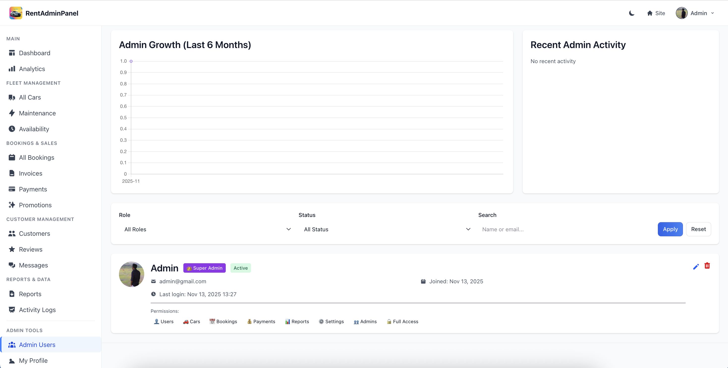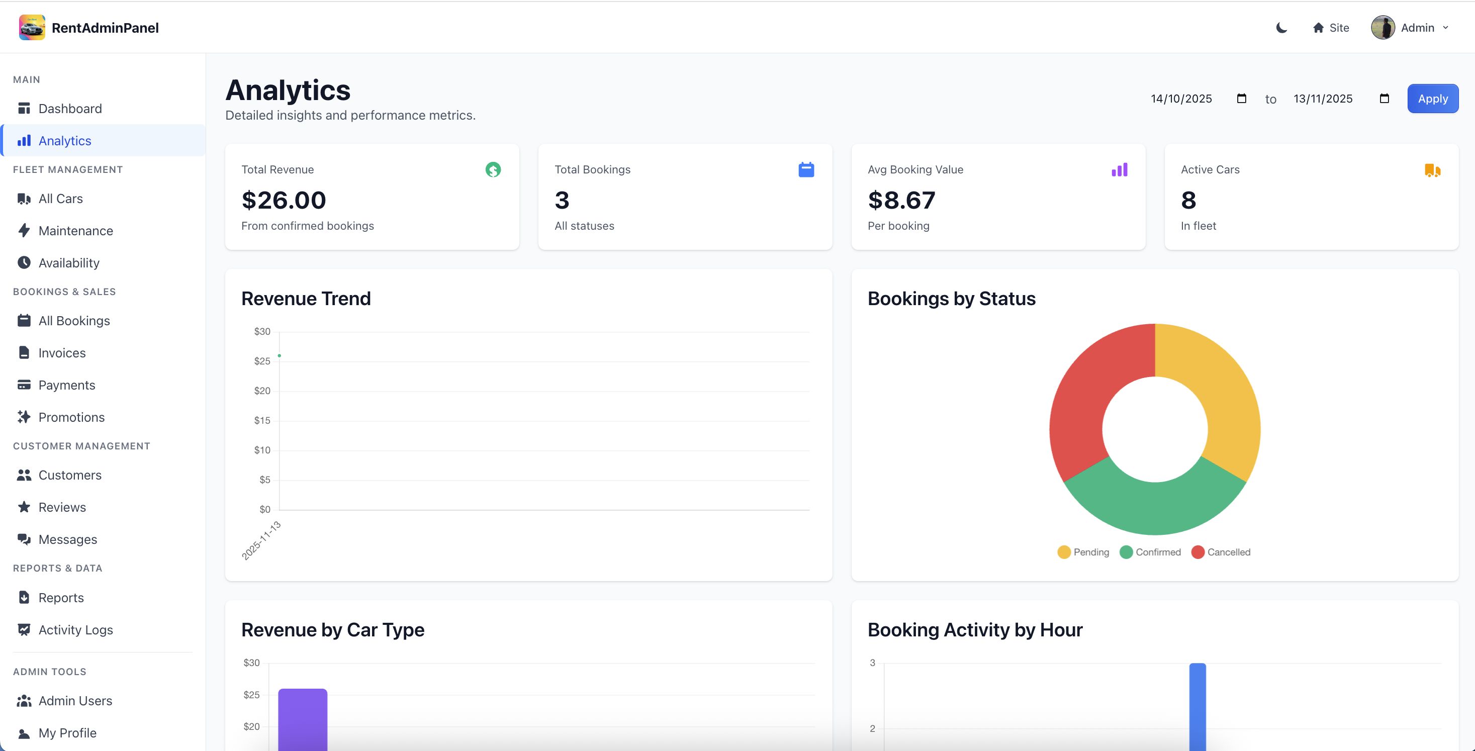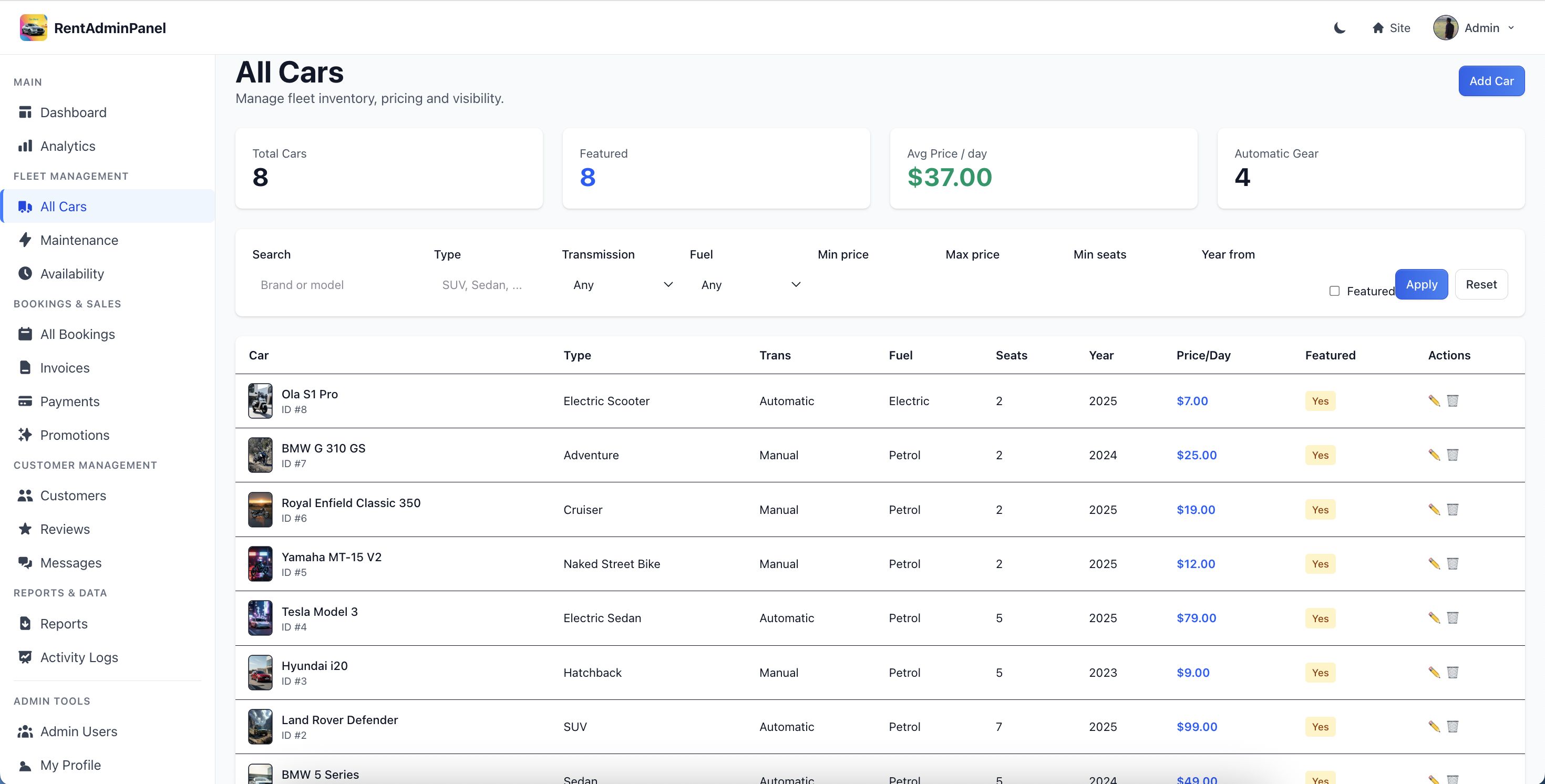Add vehicles, set availability blocks, configure promos & affiliate percent.
