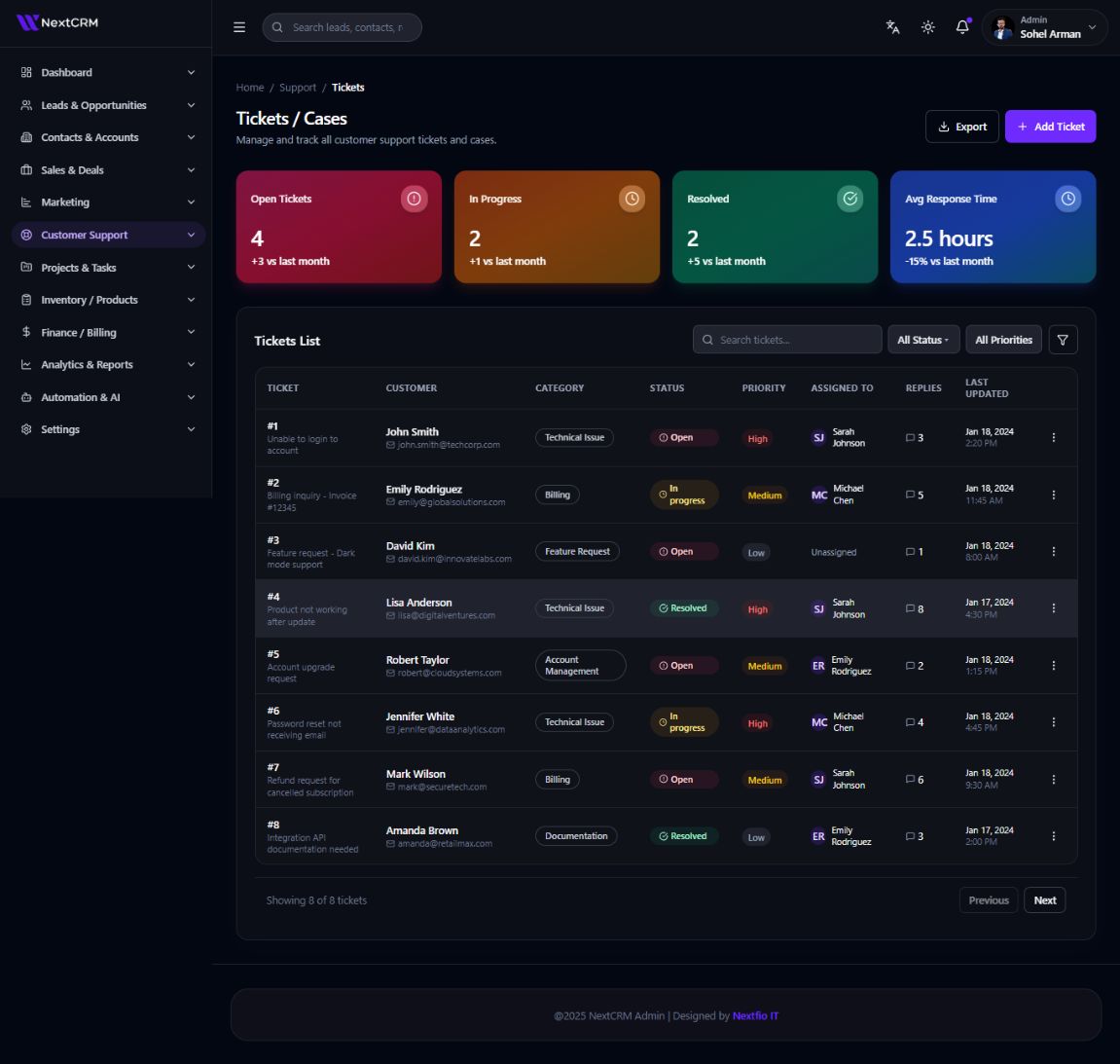 NextCRM is a modern React + TypeScript admin dashboard template for CRM software. Built with Vite and Tailwind CSS, it provides blazing-fast dev experience, responsive layout, dark/light modes, RTL support, and an extensive UI kit. Every major CRM module is covered- leads, sales, marketing, automation, finance, inventory, projects, support, and settings, so you can plug in your backend and ship rapidly.