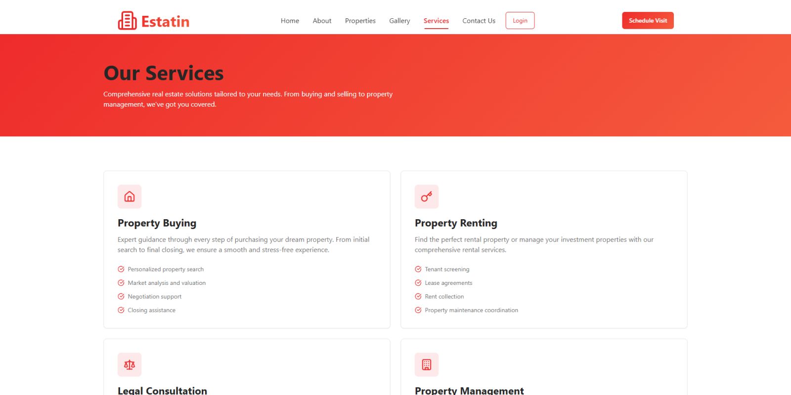 Estate is a modern, fully responsive real estate platform with a clean, professional, and user-friendly interface. It uses HTML, Tailwind CSS, JavaScript, and React to deliver fast performance, smooth interactions, and an organized layout for property listings, rentals, and real estate businesses. Every section of the platform is designed with attention to detail, providing an intuitive browsing experience for users on all devices, including mobiles, tablets, laptops, and desktops.