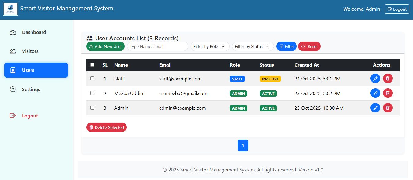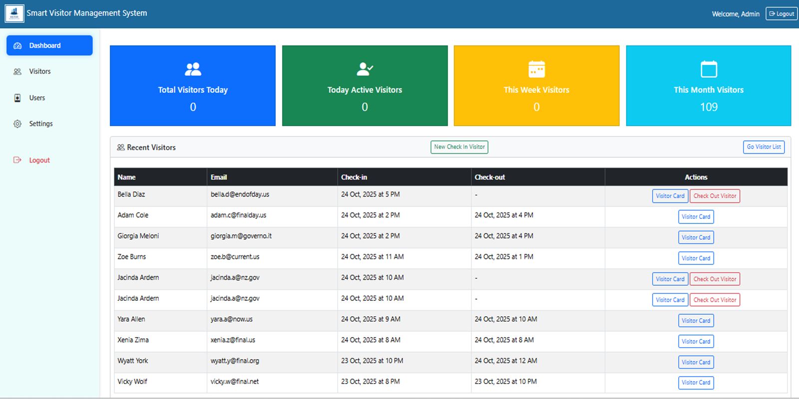 The Smart Visitor Management System (SVMS) is a PHP & MySQL web application designed to track and manage visitor check-ins, check-outs, and reports in an organization. It includes admin and staff roles, a modern dashboard, and robust reporting with Excel and PDF export.