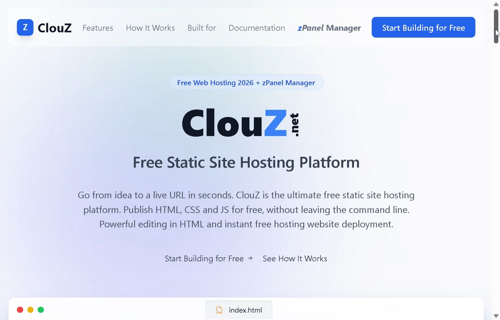 Go from idea to a live URL in seconds. ClouZ is the ultimate free static site hosting platform with zPanel Editor. Publish HTML, CSS and JS for free, without leaving the command line. Powerful live editing in HTML and instant free hosting website deployment.