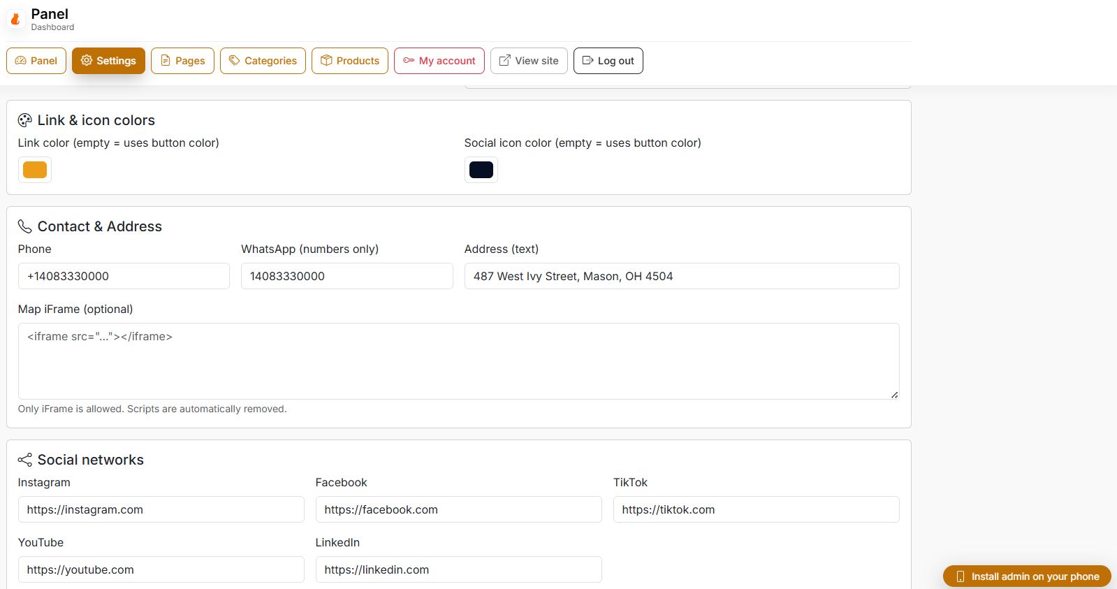 7. Change the admin password, remove demo items if needed and review site settings (title, logo, WhatsApp number, address, social links).