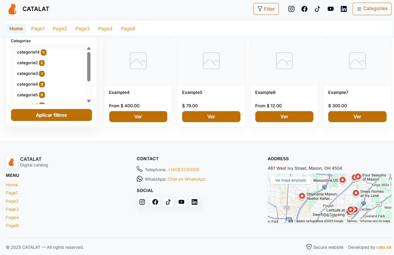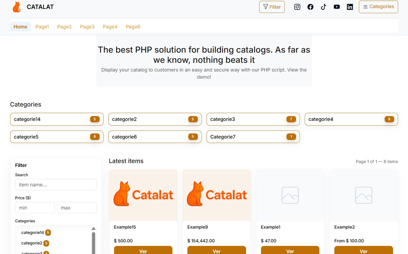 Catalat is a self-hosted PHP catalog and rental system built with Bootstrap 5. It gives you a modern public catalog and a focused admin panel in one package. You install it on your own shared hosting and keep full control over items, categories, pages, colors and languages.
