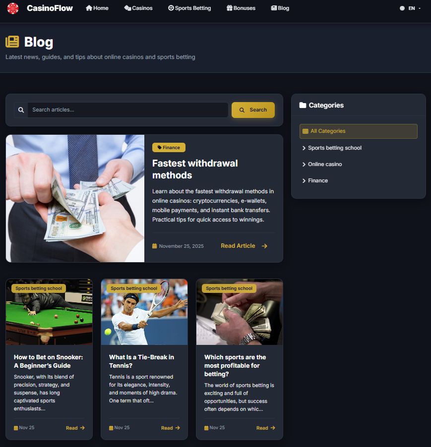 Create a modern casino & bonus listing website with ease. Multi-language, SEO-ready, clean design, and fully customizable.CasinoFlow – Casino Affiliate CMS