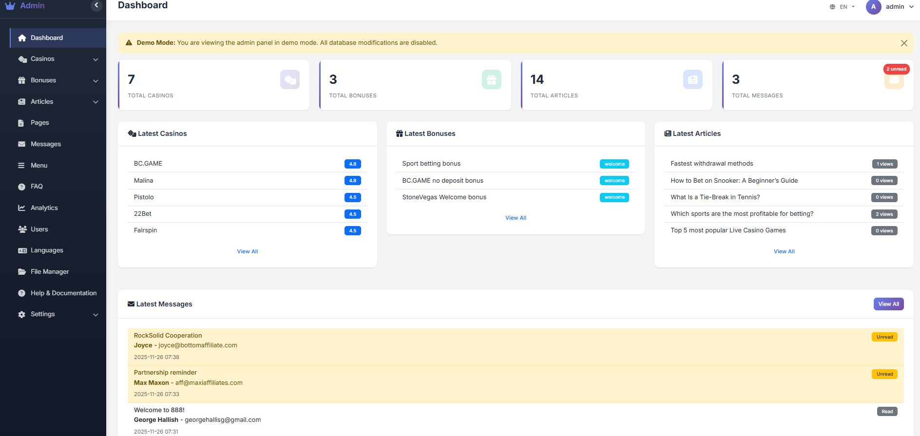Easily add, edit, and organize online casinos, bonuses, promo codes, and offer types. Clean structure, fast loading, and SEO-optimized layouts.