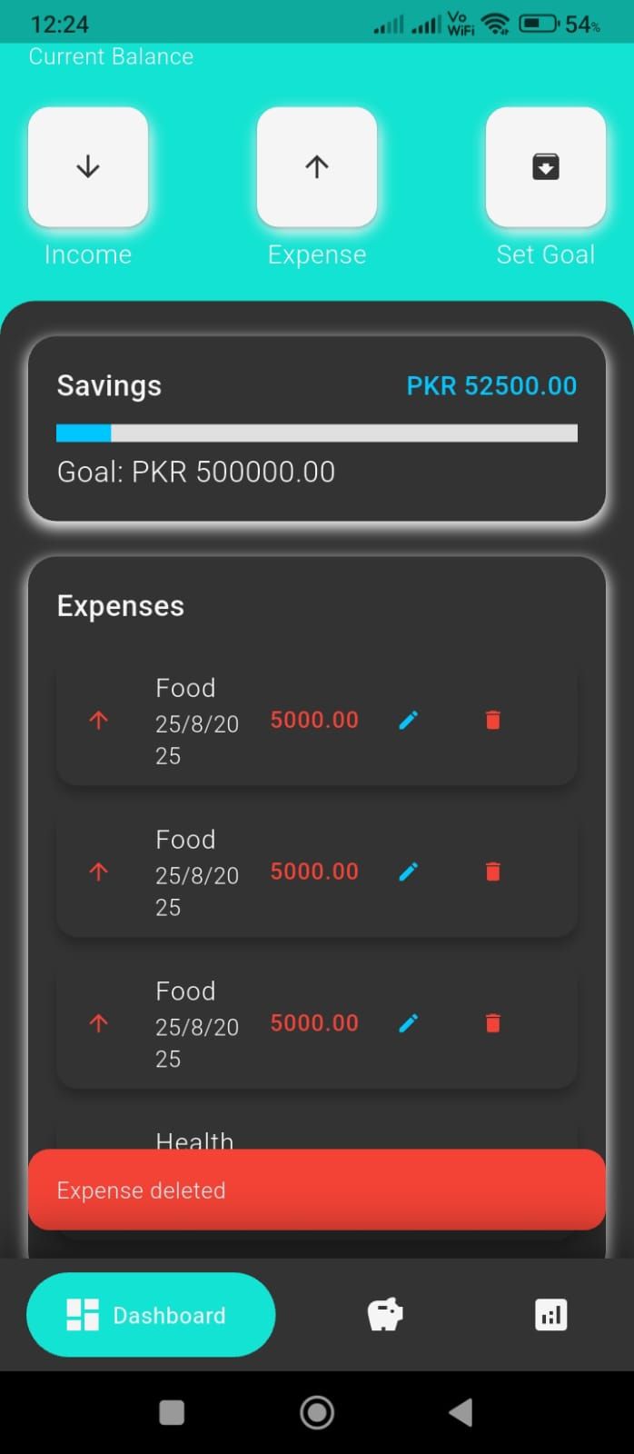 - Dashboard Screen – Displays an overview of income, expenses, and savings using cards and summary widgets.