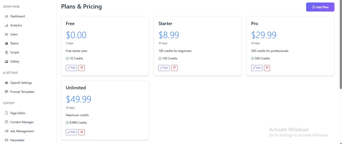 The system includes a credit-based monetization model, Stripe payment integration, multi-language support, team collaboration, and a powerful admin panel, making it ideal for launching your own AI SaaS business.