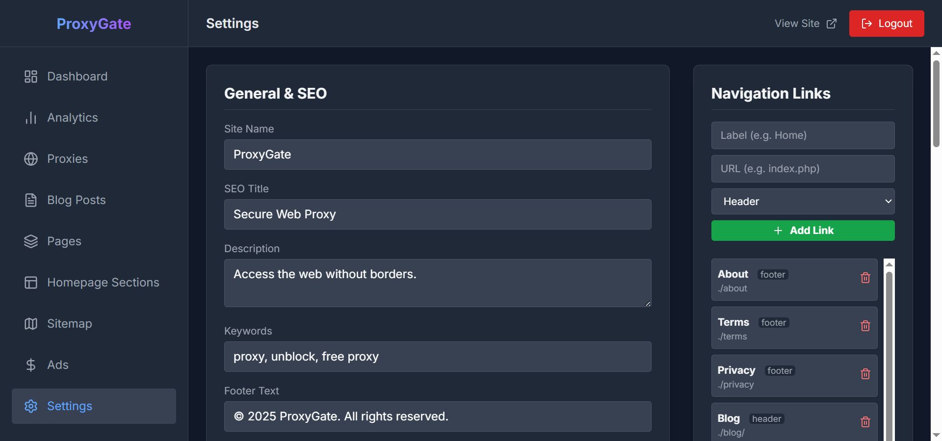 Modern web proxy script with admin panel, analytics, blog system, and multi-proxy support (HTTP/HTTPS/SOCKS4/SOCKS5).ProxyGate - Fast And Simple Secure Web