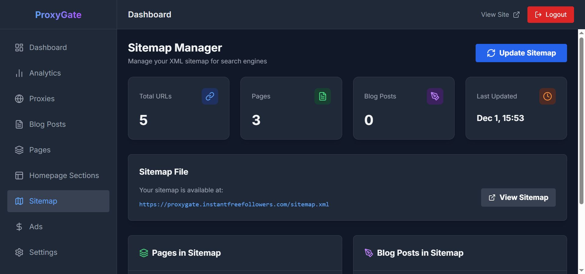 - Admin panel to manage pages, blog posts, proxy entries, sections, and site settings.