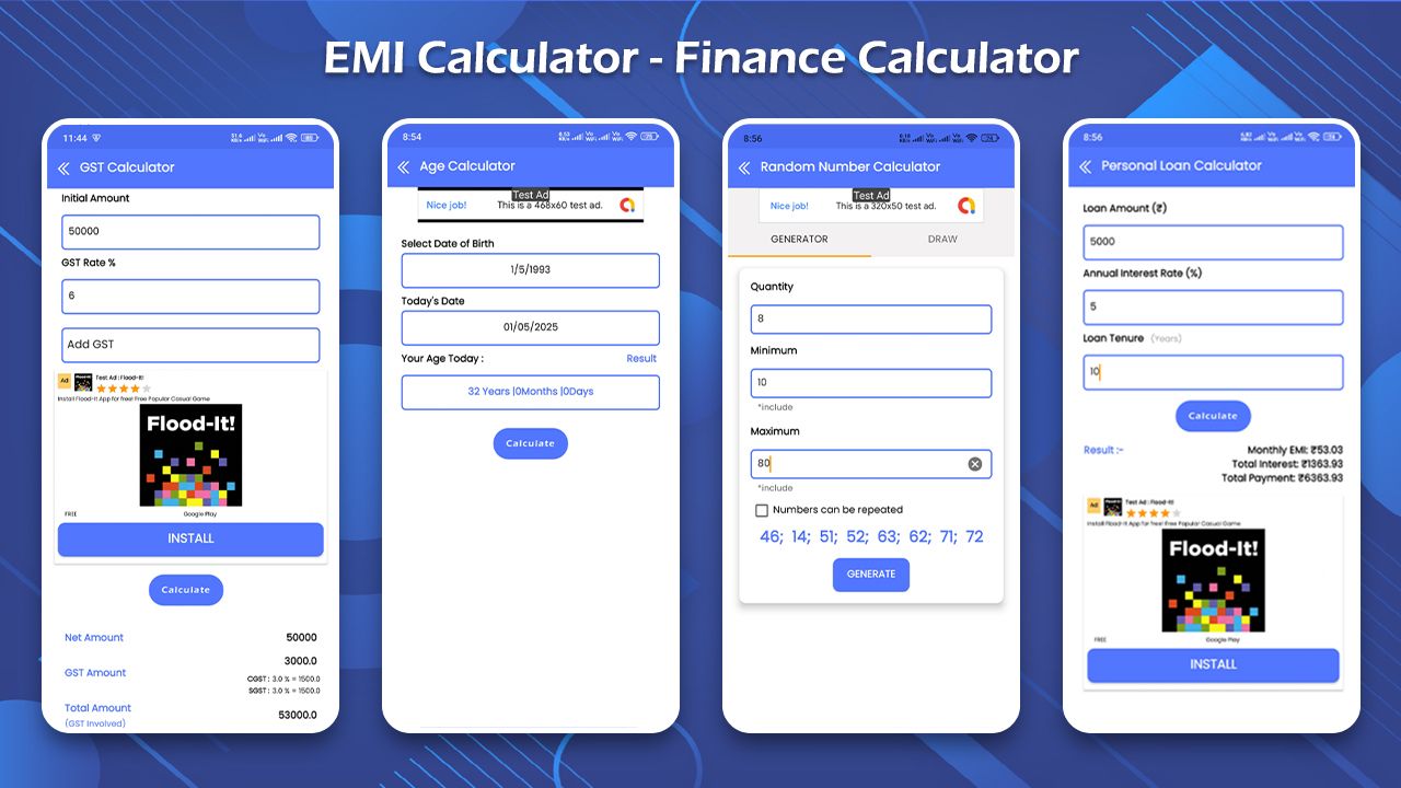 (1) EMI Calculator :- EMI Calculator, Loan Compare Calculator, EMI Advance Calculator, GST Calculator, VAT Calculator, Age Calculator, Discount Calculator, Percentage Calculator, Equation Calculator, Random Number Calculator