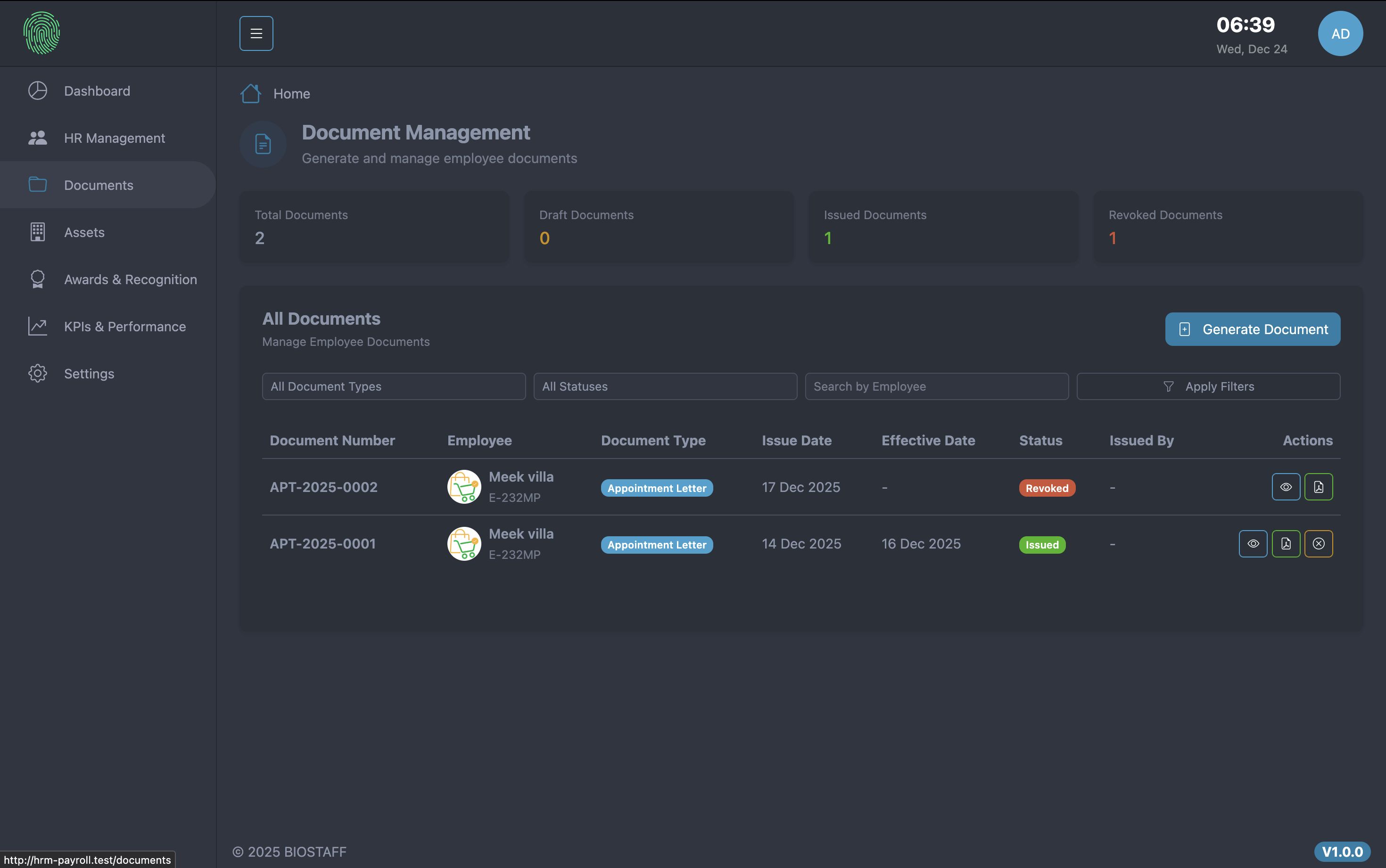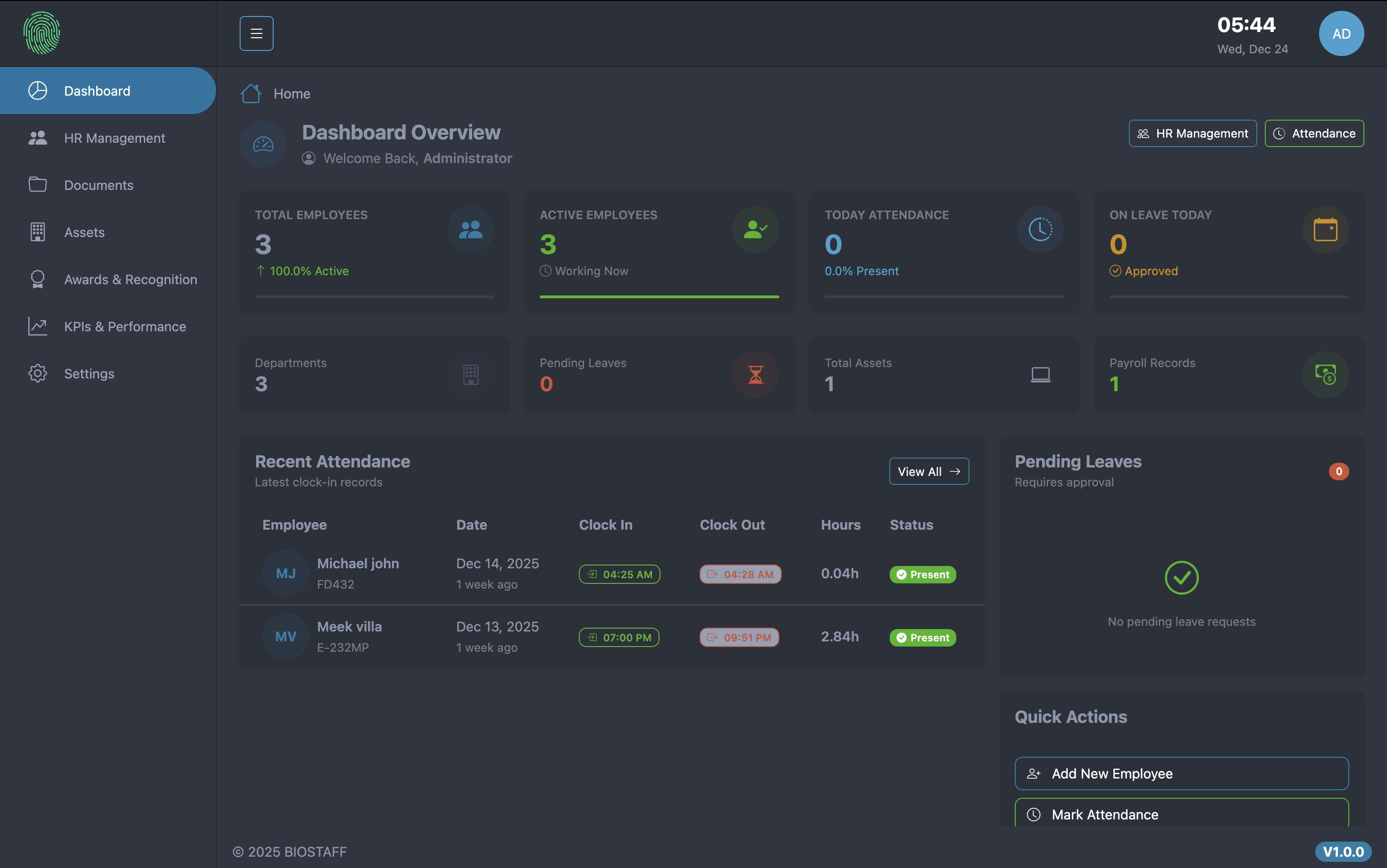 BIOSTAFF is a comprehensive, all-in-one Human Resource Management and Payroll solution built with Laravel. Designed for businesses of all sizes, BIOSTAFF streamlines HR operations with powerful features including biometric attendance tracking, KPI performance management, automated payroll processing, and a self-service employee portal.