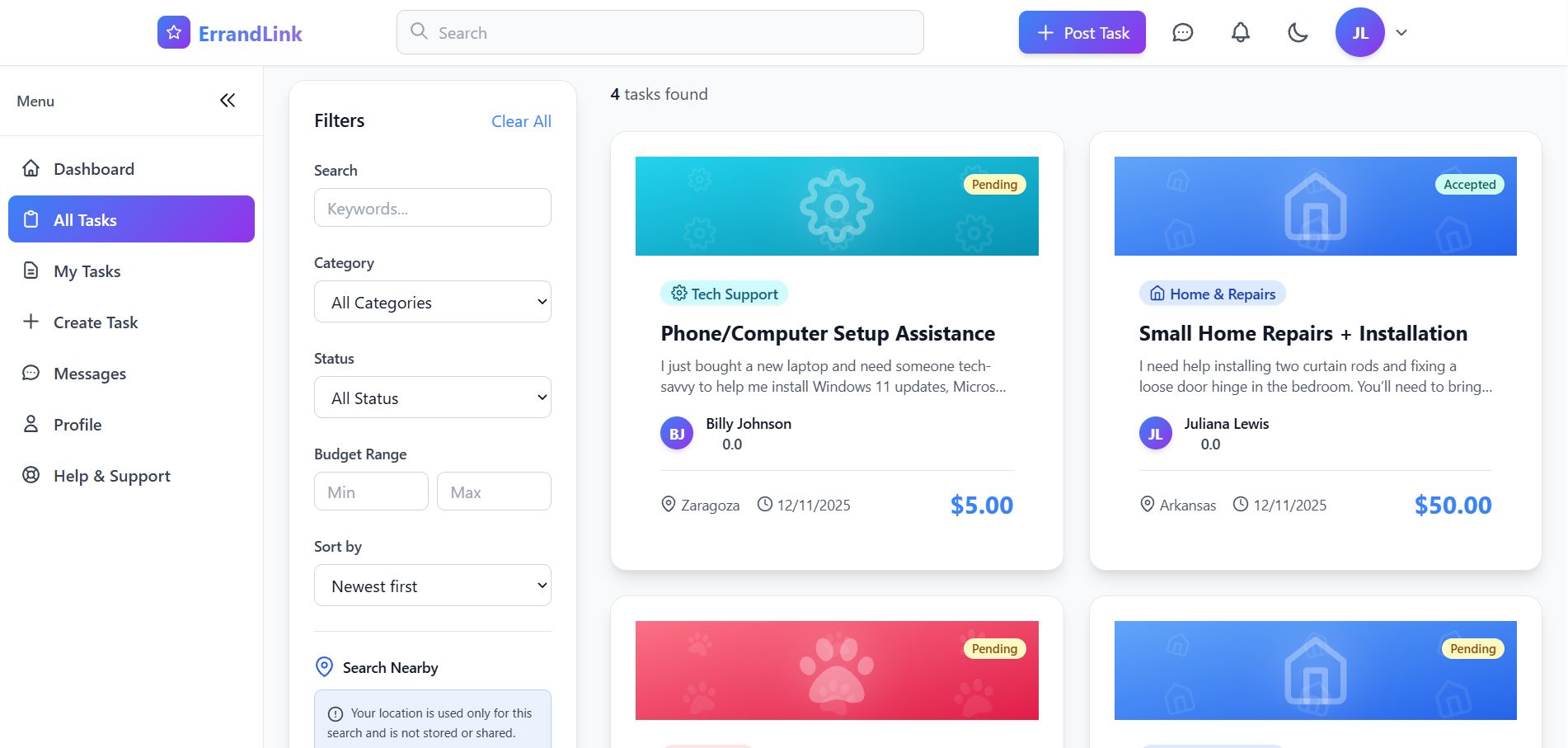 - Post Tasks - Create detailed task listings with location, budget, and requirements
