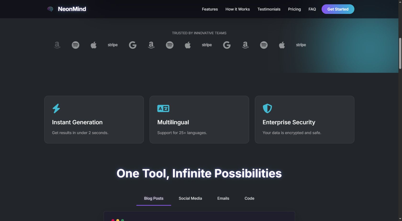 Built on the latest Bootstrap 5.3 framework, NeonMind features a stunning "Dark Mode" aesthetic with neon glows, glassmorphism effects, and futuristic typography. Unlike standard templates, it includes advanced interactive elements like 3D tilt cards, infinite scrolling logo marquees, and typewriter text animations to give your product a high-end feel.