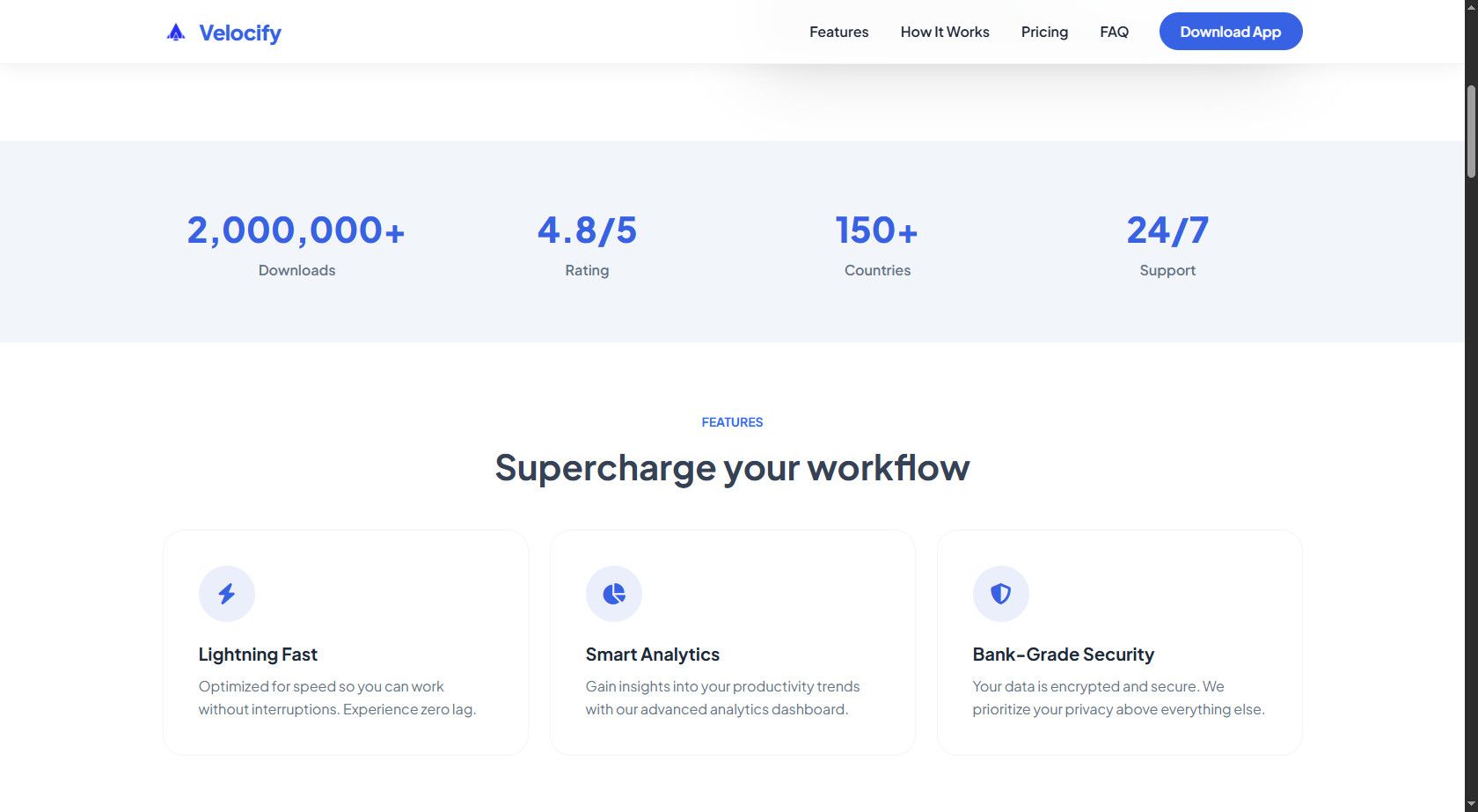 Built with Bootstrap 5.3 and designed with a conversion-first approach, Velocify combines a clean "Apple-style" aesthetic with powerful marketing sections. It features a sticky navigation, animated statistics counter, video presentation modal, and a beautiful zig-zag features layout.
