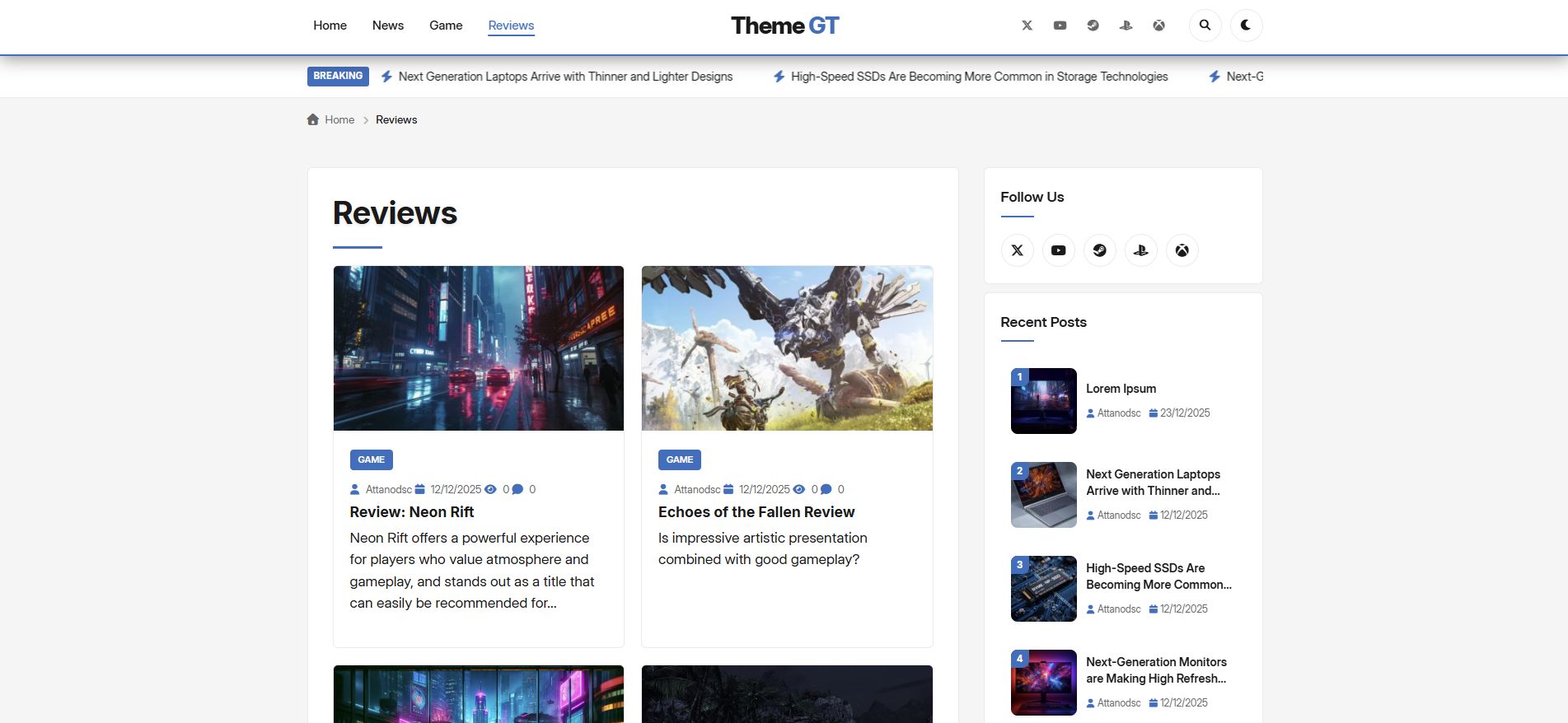 GT News is a modern and professional WordPress theme specifically designed for gaming, technology, and news websites.