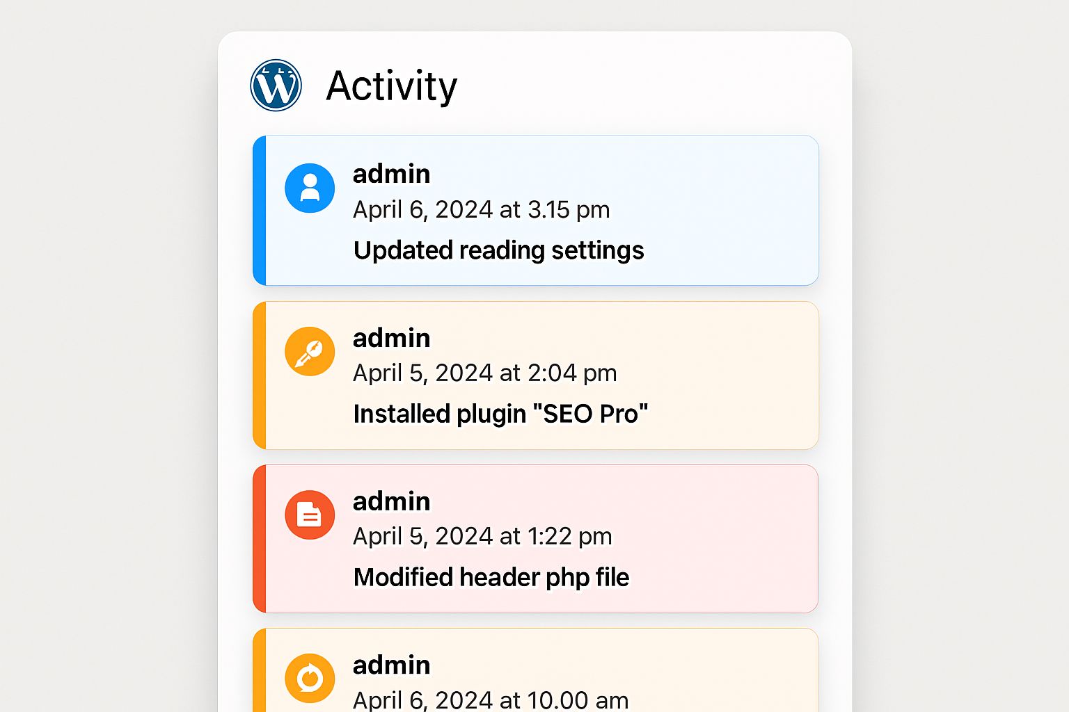 The plugin works without any external API and runs completely inside WordPress, ensuring full privacy and performance. A smooth, modern admin interface makes it easy to review actions like settings changes, plugin activation/deactivation, file edits, and user management events.