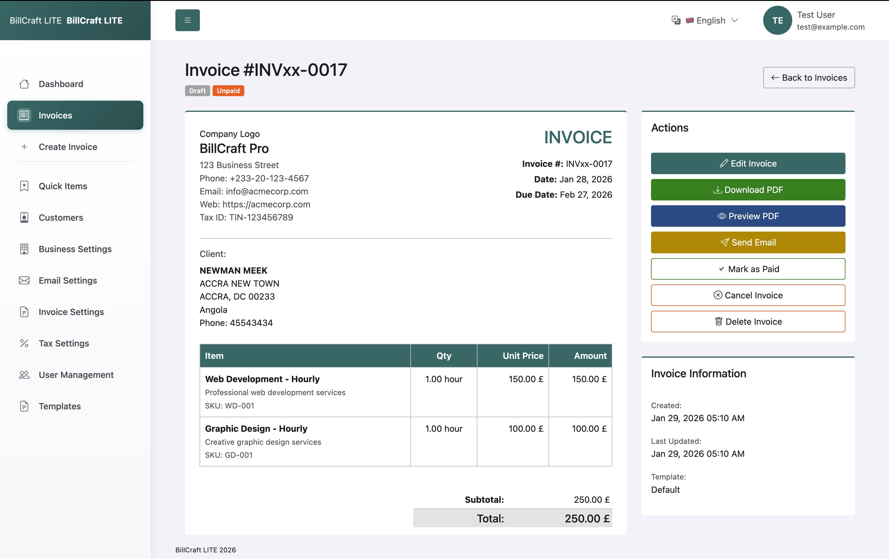 - Multiple invoice status tracking (draft, sent, paid, partial, overdue, cancelled)