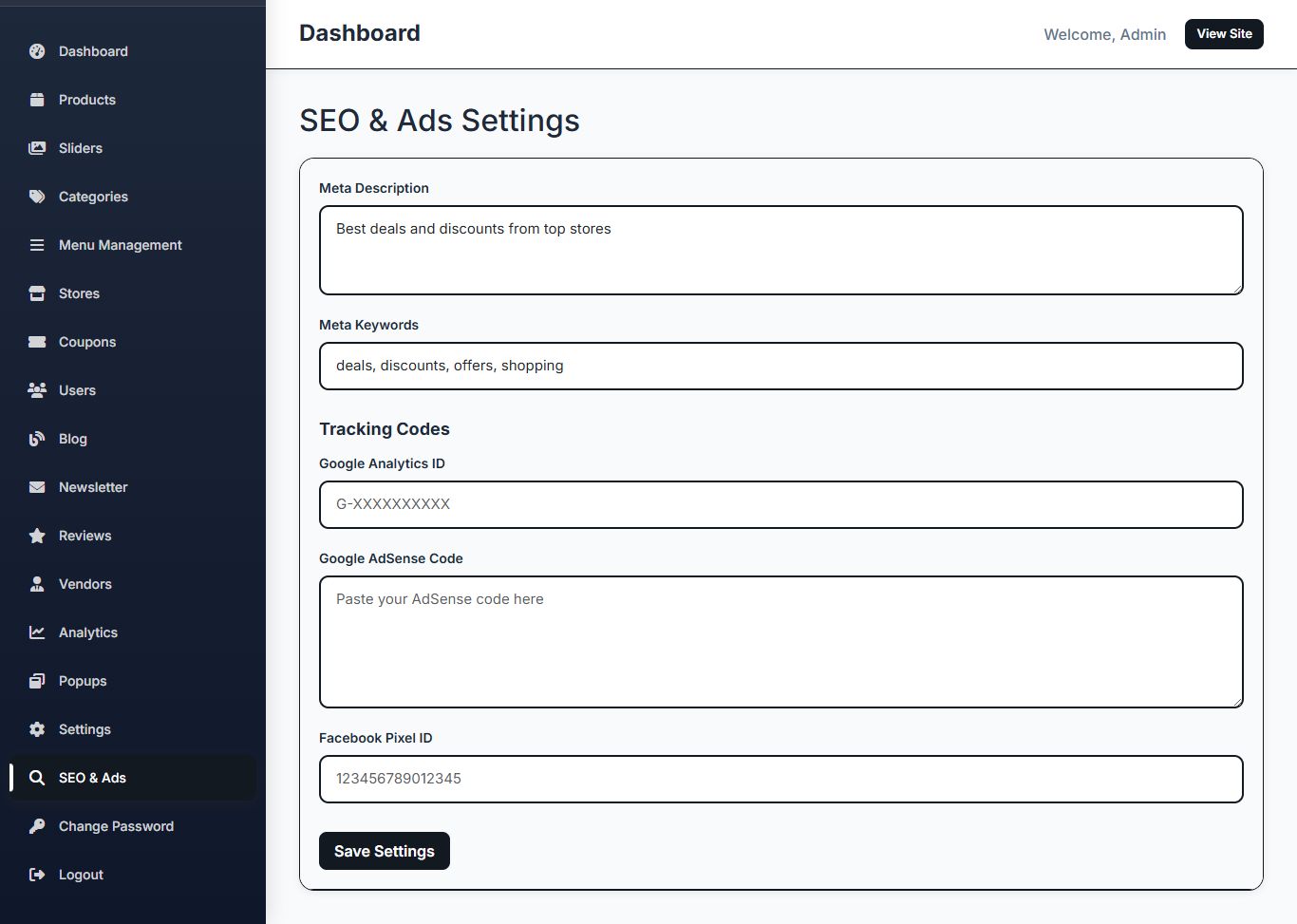 - Advanced SEO Tools: Fully integrated admin section for managing meta tags, Google Analytics, AdSense, and Facebook Pixel to maximize traffic and conversions.