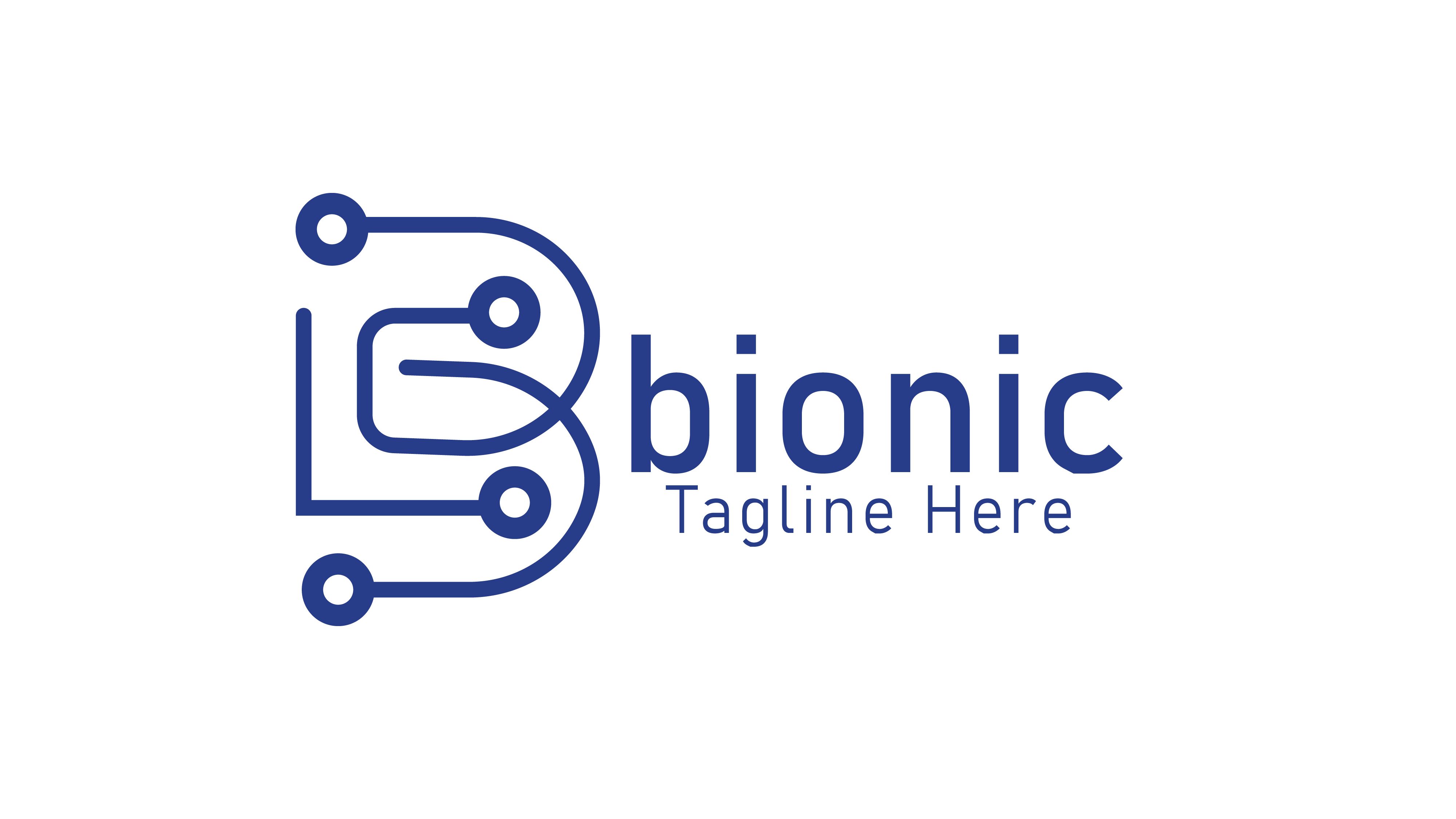 A professional and minimalist logo featuring a stylized letter "B" integrated with circuit board nodes and interconnected pathways. The clean blue aesthetic represents innovation, bionic technology, and digital connectivity. Perfect for startups in artificial intelligence, biotechnology, robotics, or software development.