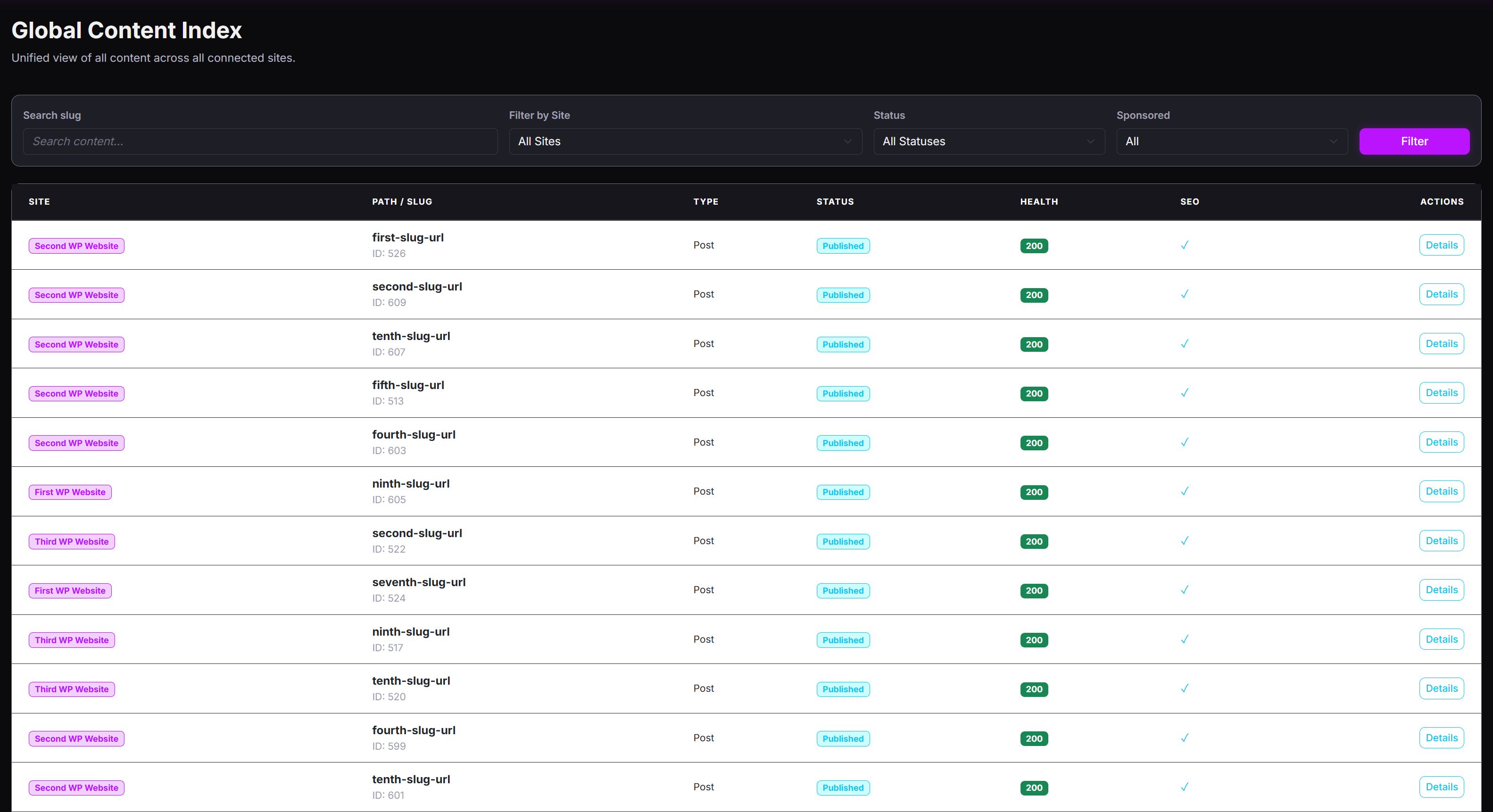 It provides a unified content index, synchronization tools, SEO metadata visibility, audit logs and system-level controls, making it ideal for content managers, SEO specialists and developers working with multiple WordPress installations.