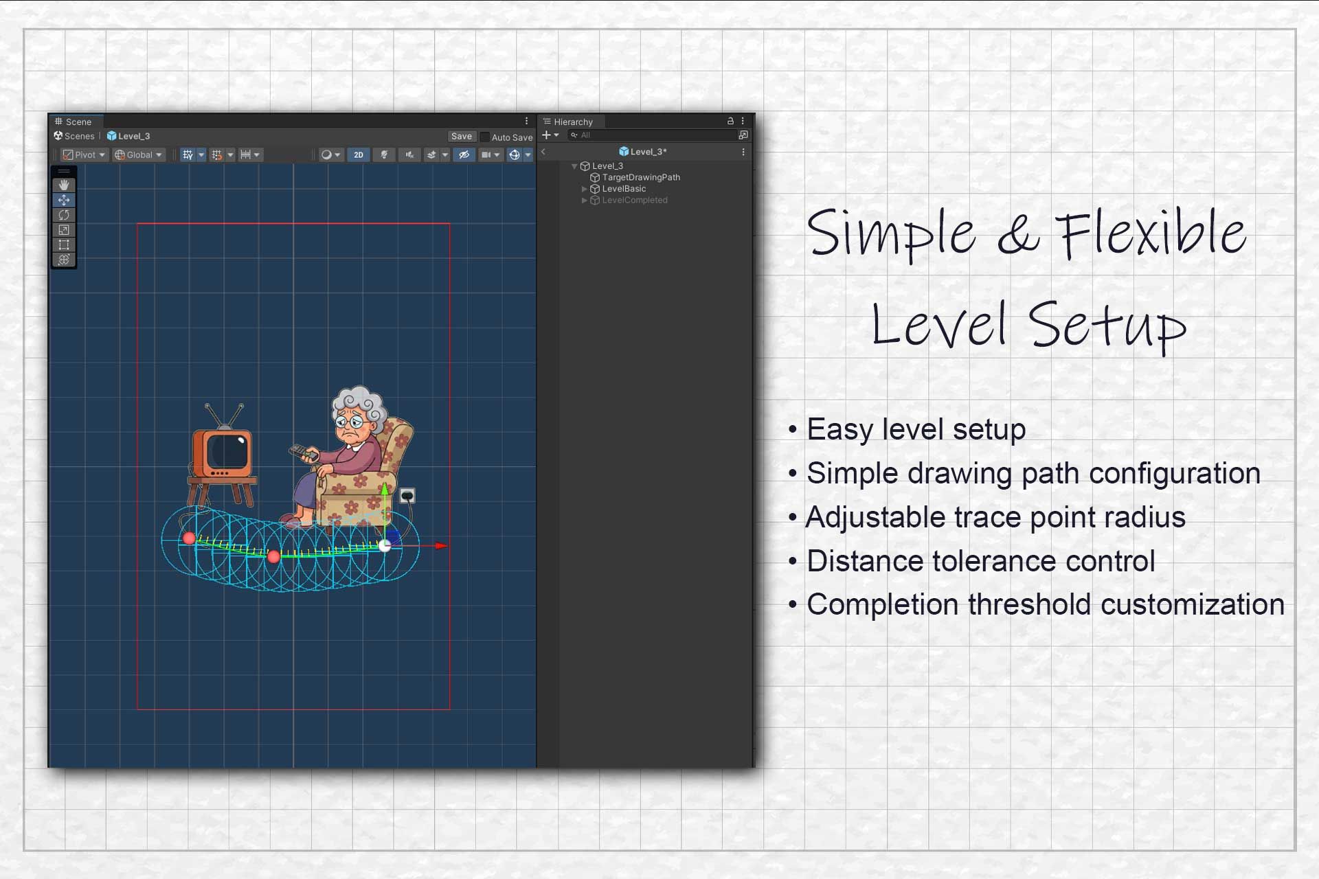 Draw the missing part to solve clever puzzles! A fun, brain-teasing DOP puzzle game template ready to reskin and publish.Draw one piece Unity Template