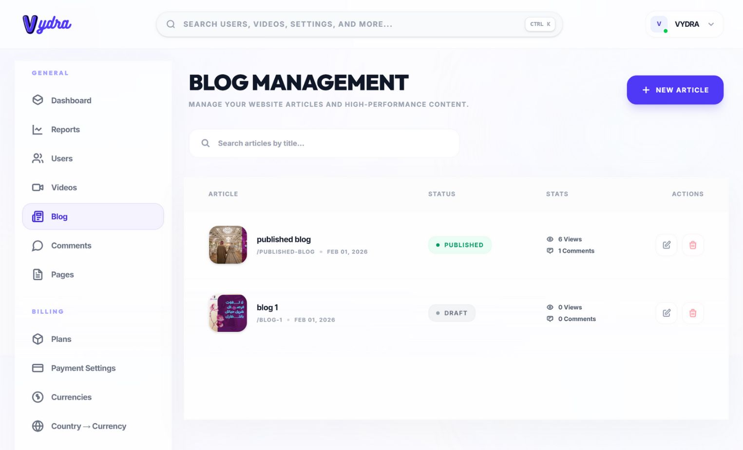 - Built-in Blog & CMS: Create marketing pages (About, Terms) and blog posts with SEO meta tags.