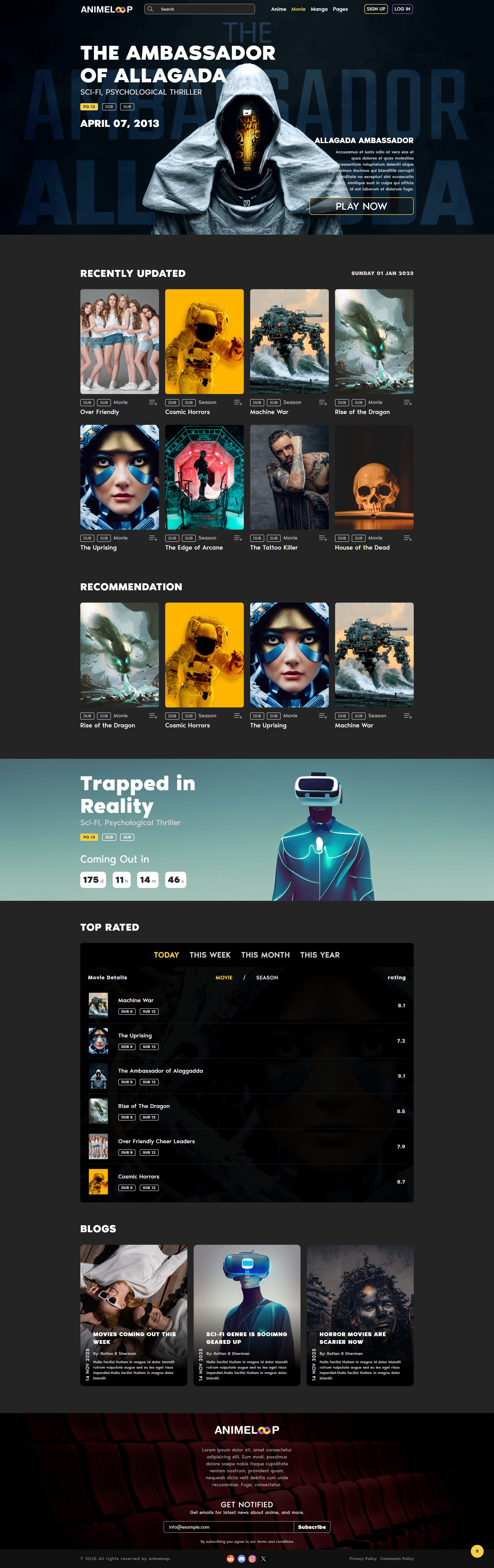 Elevate your online entertainment venture with Anime Loop, the ultimate Anime Manga and Movies Streaming HTML Website Template. With a seamless movie website streaming experience at its core, Anime Loop stands as the definitive choice for anyone seeking to create a captivating online platform. Boasting Movie Streaming Website Templates that effortlessly showcase your cinematic offerings, coupled with Film Poster Templates that add visual allure, Anime Loop guarantees an immersive journey for movie and anime enthusiasts. Its Video Streaming Website Template adapts to diverse content, while specialized Anime Website Templates cater to enthusiasts with precision. With the Stream Template, Anime Loop ensures a dynamic and uninterrupted viewing experience. It's more than just a template; it's the template for movie websites and the go-to choice for website templates for movies. Its movie template and Movie Website Templates allow you to organize and present your film library flawlessly. Whether you're crafting an anime site or a general video streaming platform, Anime Loop's Video Streaming Template delivers excellence in every frame. Unlock the full potential of your online streaming venture with Anime Loop today.